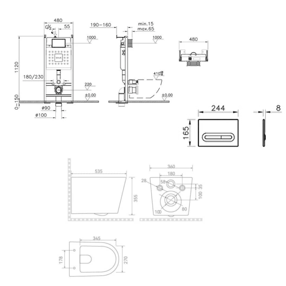Caractéristiques du pack WC bâti-support autoportant Vitra V-Fix Core + WC suspendu sans bride + abattant SoftClose + Plaque chrome mat (VFTFCETOR5) :
