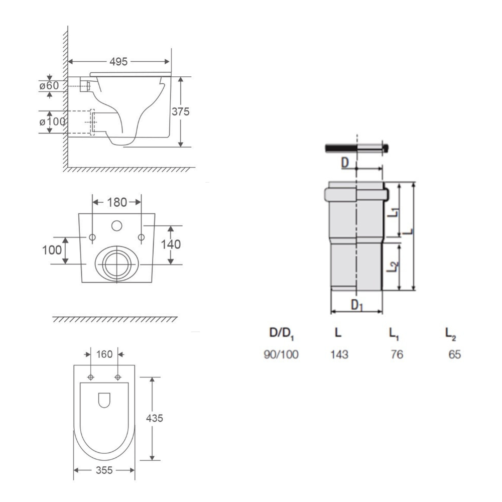 - Fournis avec pipe d'évacuation en PEHD (noire) diamètre 90 mm (Type Geberit / Grohe ) vers un réseau PVC (gris) en diamètre 100 mm (Standard Français)