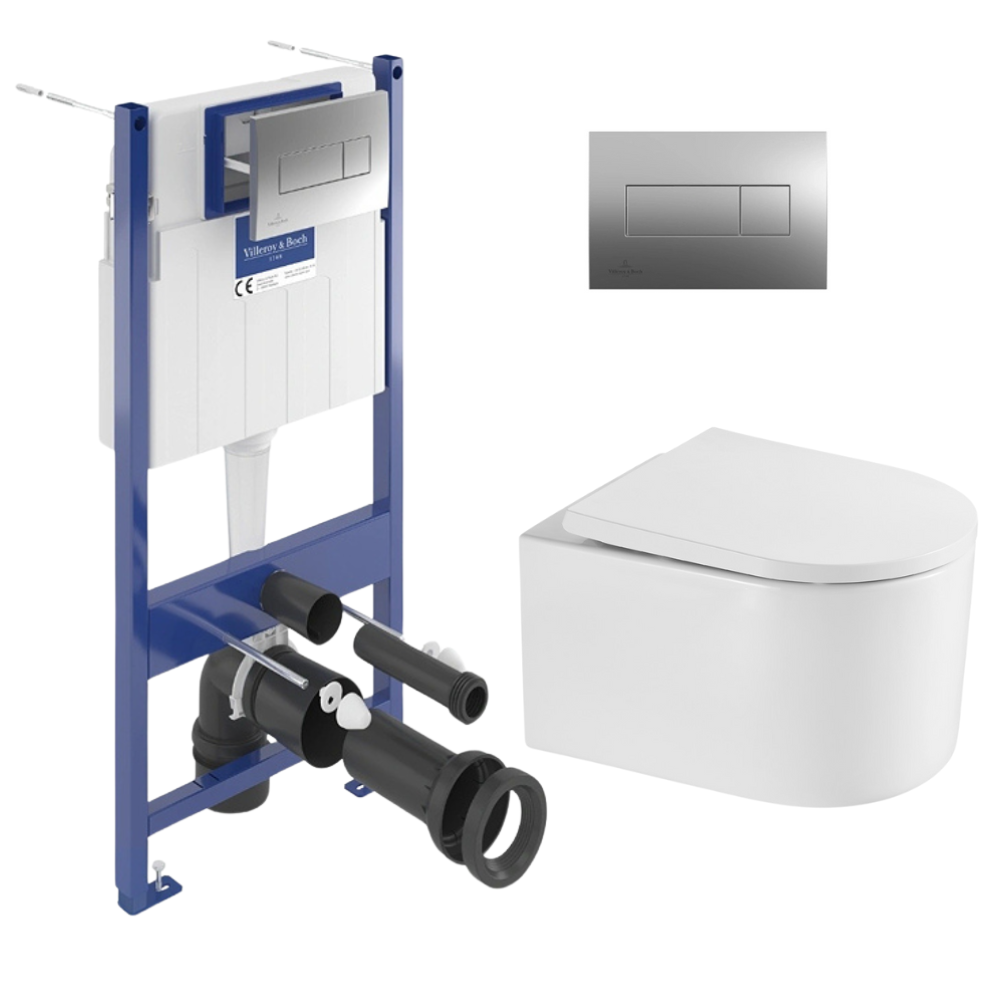 Caractéristiques du pack WC bâti-support sol-mur Villeroy & Boch ViConnect Pro S + WC suspendu sans bride, fixations invisibles Swiss Aqua Technologies + abattant SoftClose + plaque chromé (VCNDELANOTQ2CH) :
