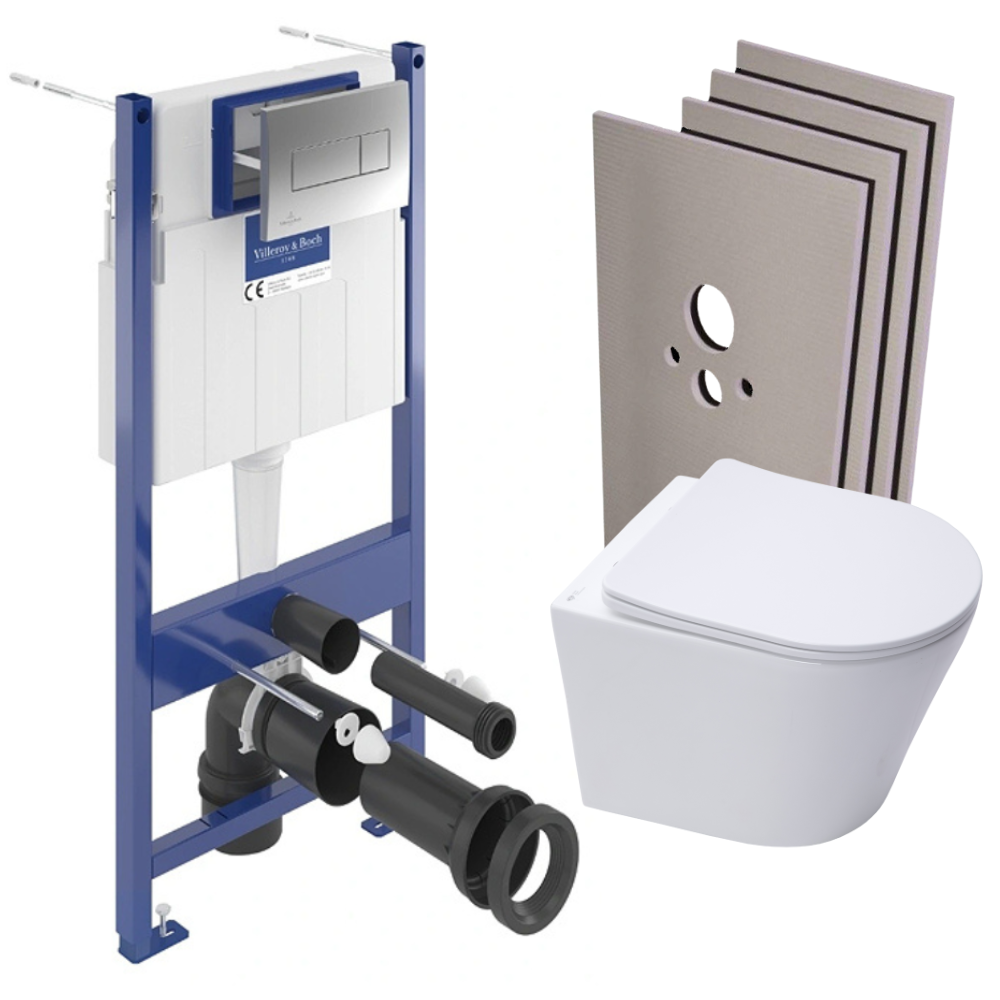 Caractéristiques du pack WC bâti-support sol-mur Villeroy & Boch ViConnect Pro S + WC suspendu sans bride et fixations invisibles Swiss Aqua Technologies + abattant Softclose + set de montage pour habillage de bâti-support + plaque chromé (VCNINFI2CHSB) :