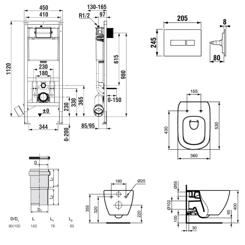 Bâti-support encastrable pour WC suspendu, installation sur cloison légère, hauteur 112 cm, chasse 2/4-6 L (A8900200Z0) :