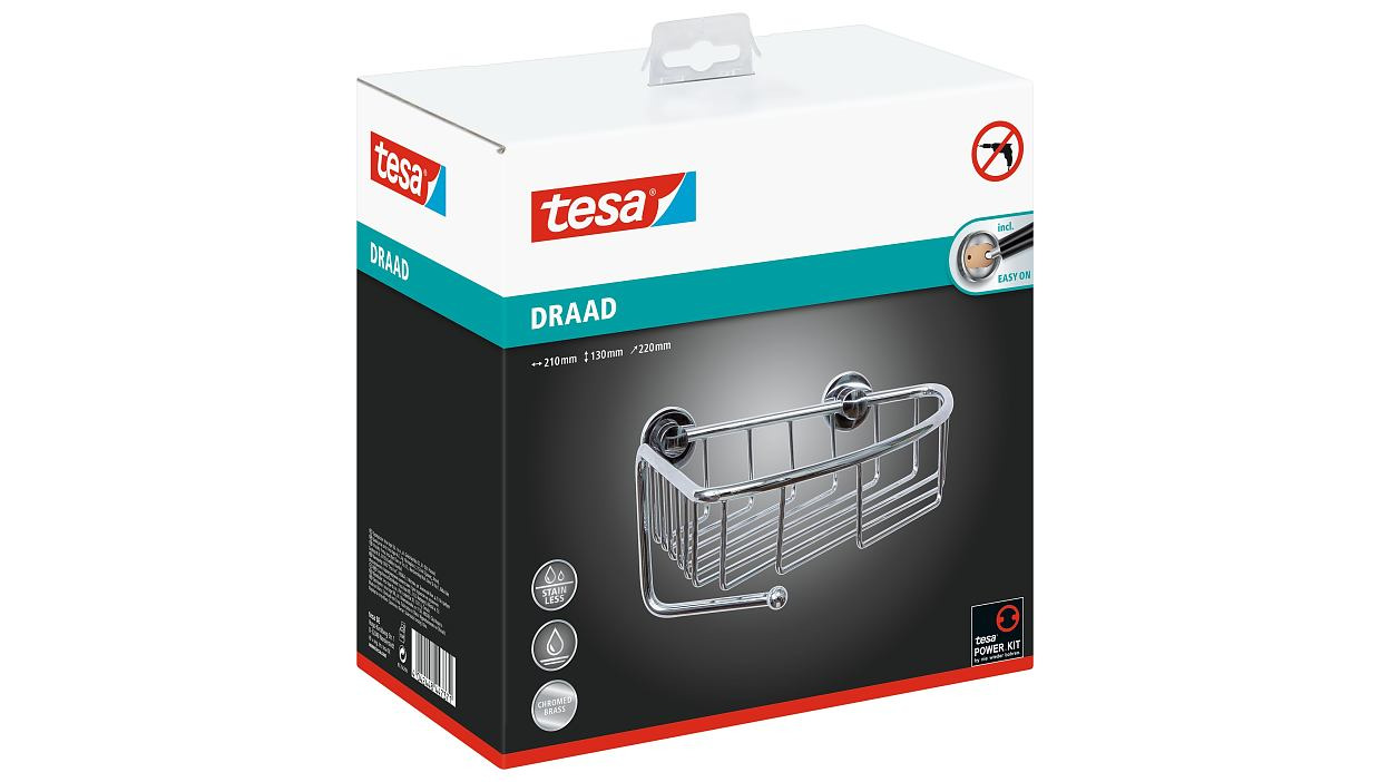 Sous la douche ou dans la baignoire, vous souhaitez avoir vos articles de toilette toujours à portée de main. Le panier d'angle tesa® Draad offre suffisamment d'espace pour cela, plus un crochet en dessous. Fabriqué en laiton avec chromage brillant, ce bel accessoire rehaussera votre salle de bain. Pour le montage, on utilise de la colle au lieu de percer. Vos murs et carrelages restent ainsi préservés. Le panier d'angle peut être retirée à tout moment sans laisser de traces.