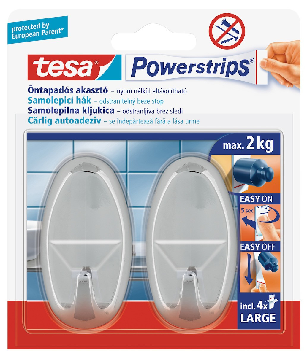 Caractéristiques des 2 grands crochets, chrome, pose facile sans perçage, Tesa Powerstrips (58050-00101-00) :