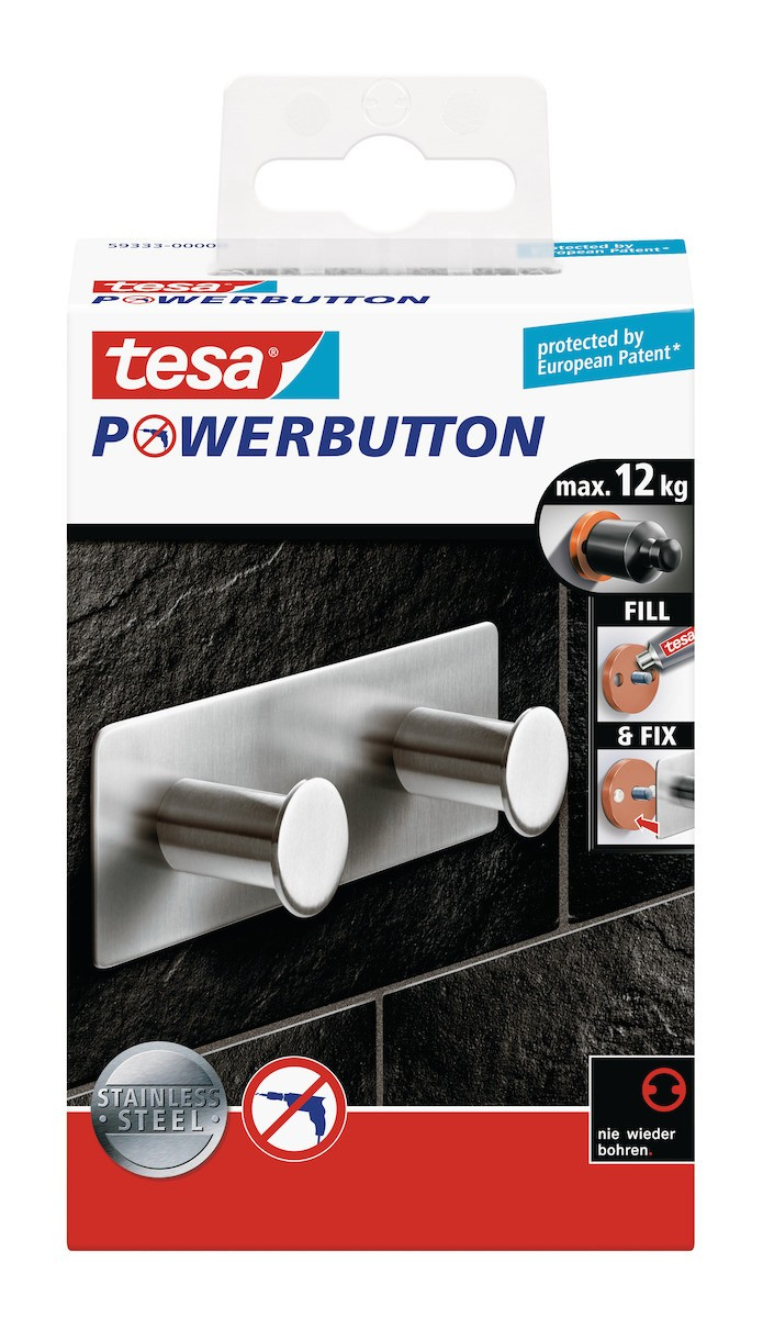 Tesa Powerbutton Crochet porte-serviette double, acier inoxydable, pose facile sans perçage (59333-00000-00)