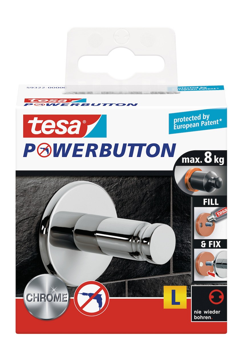 Tesa Powerbutton Crochet porte-serviette chromé, charge maximale 8 kg, pose facile sans perçage (59322-00000-00)