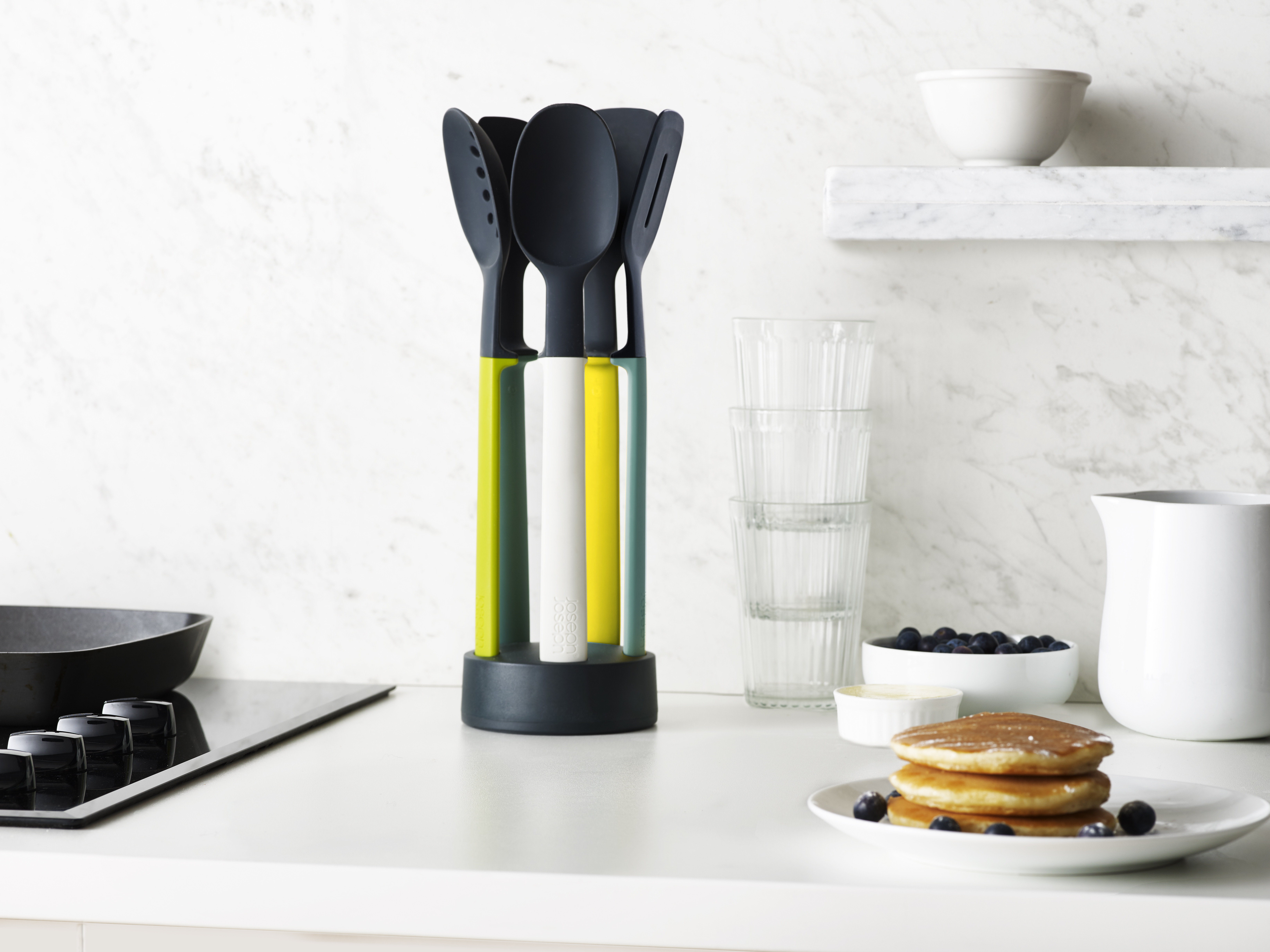 Cet ensemble d'ustensiles de cuisine comprend 5 ustensiles essentiels avec un support de rangement ultra-compact pour les ranger qui permet de gagner de la place sur votre plan de travail.