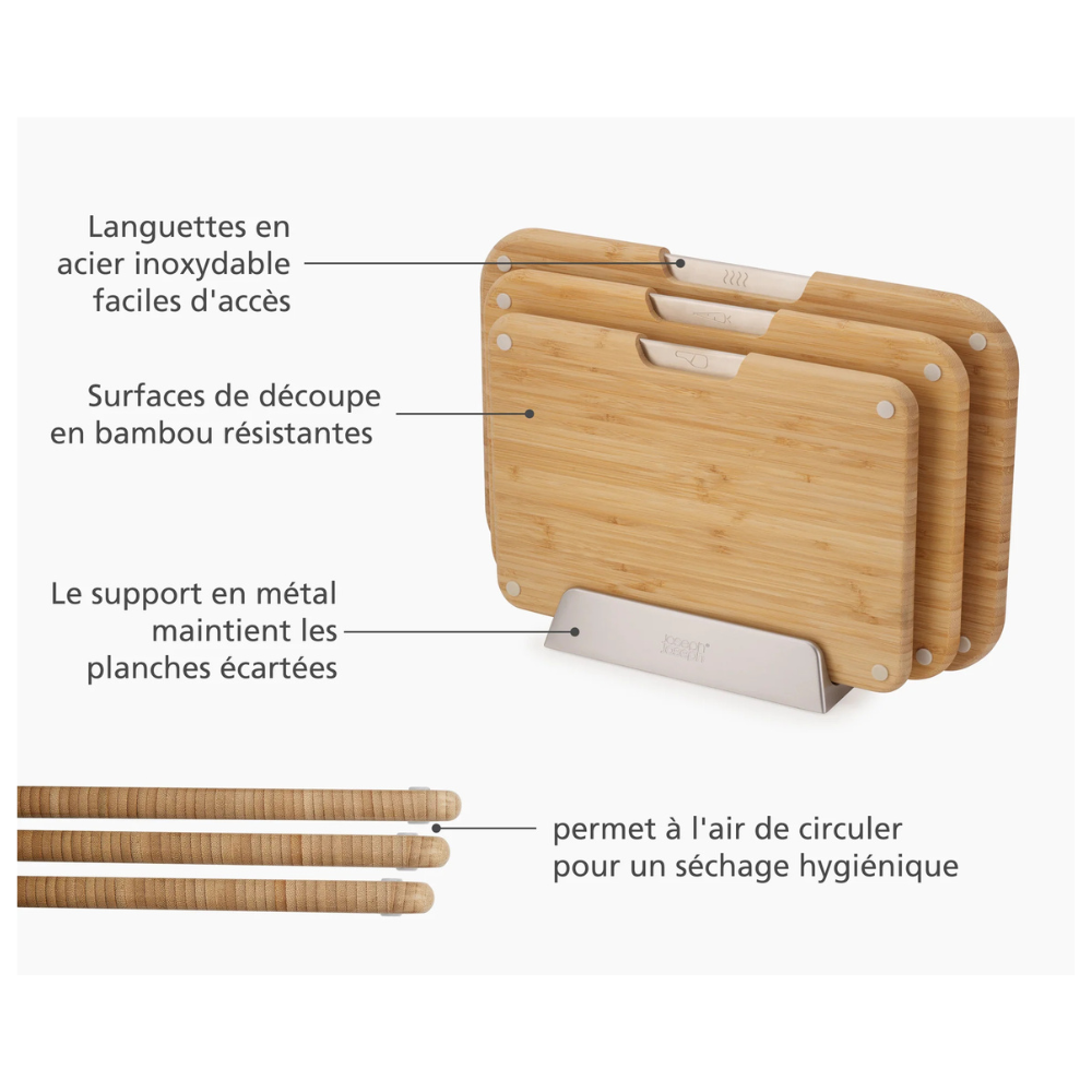 Caractéristiques de l'ensemble de 3 planches à découper en bambou Joseph Joseph Nest™ Boards (60236) :