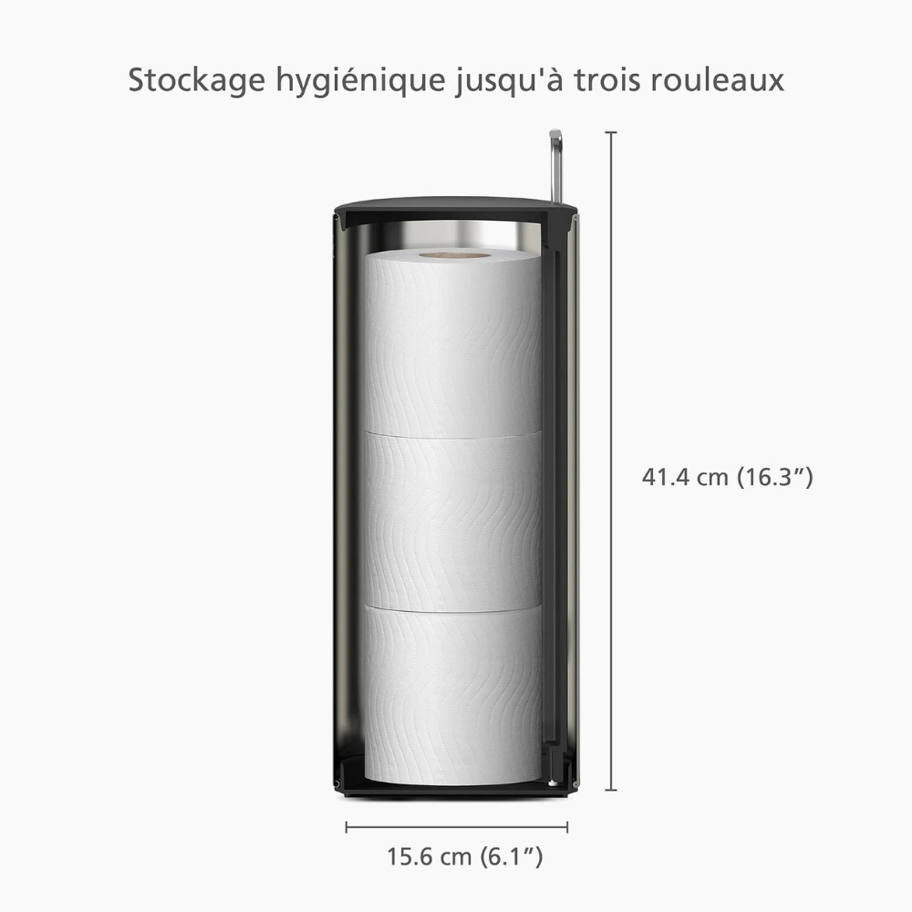 - Peut accueillir jusqu'à trois rouleaux de papier toilette de rechange, en les maintenant dissimulés.