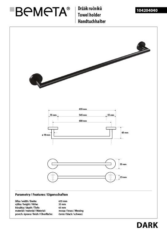 BEMETA Porte-serviettes DARK en laiton noir 65,5 x5,5x 6,5cm (104204040)