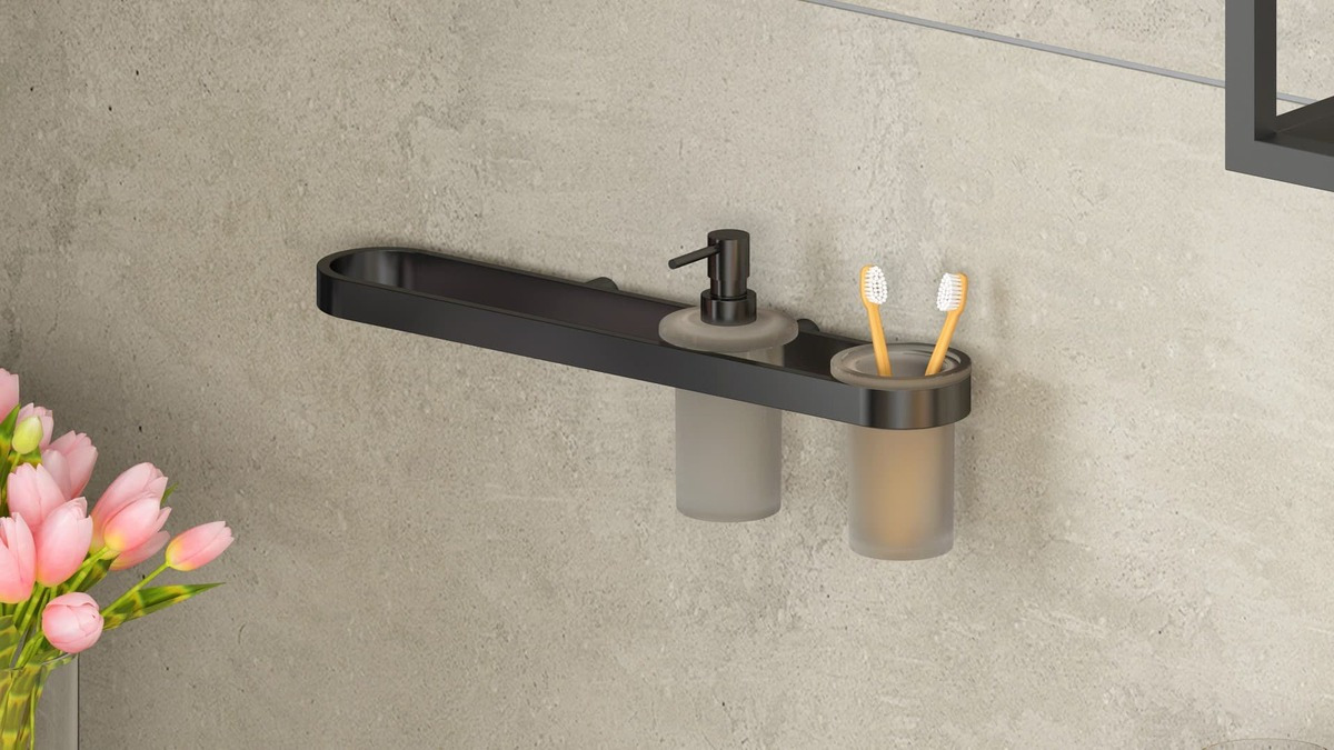 - Et le meilleur de tous - un support de conception unique pour les accessoires que vous pouvez choisir et placer complètement dans le support en fonction de votre goût ( distributeurs de savon, tasses, distributeurs de savon ).