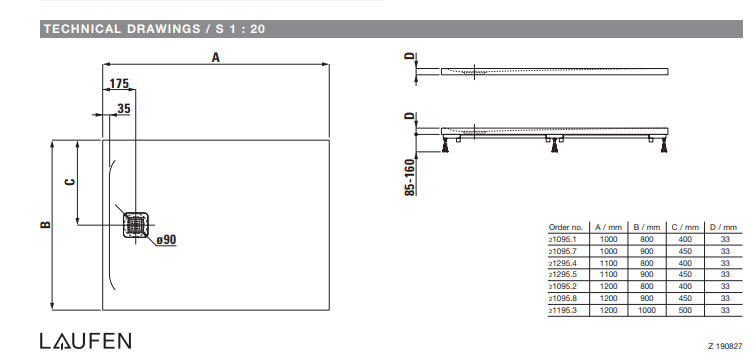 Caractéristiques du receveur de douche en gel coat Marbond, extra-plat, rectangulaire, évacuation sur le côté court du receveur 100x90, Anthracite mat, Laufen Pro (H2109570780001) :