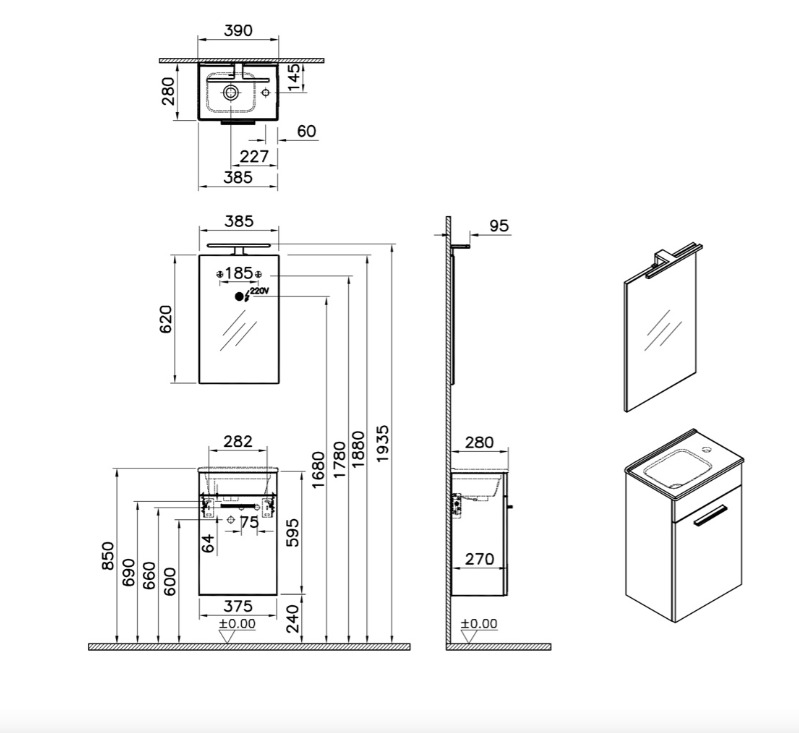 Vitra Mia ensemble meuble 39x61x28 cm avec miroir, lavabo et éclairage LED, Anthracite brillant (MIASET40A)