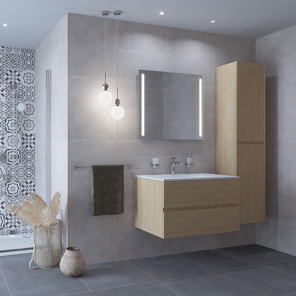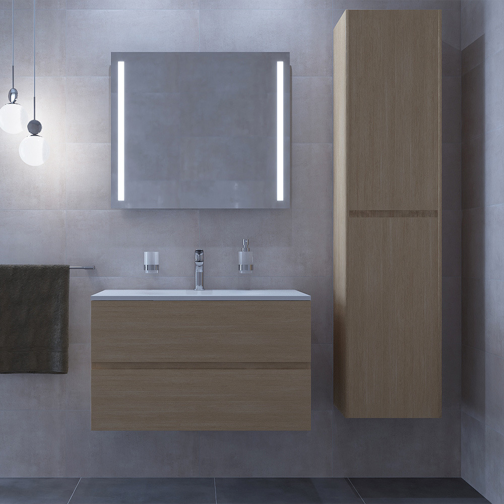 Caractéristiques du Set Meuble 86cm suspendu bois clair avec 2 tiroirs à fermeture lente + Vasque marbre coulé blanc mat + Armoire, Naturel Verona (Verona86BCC) :