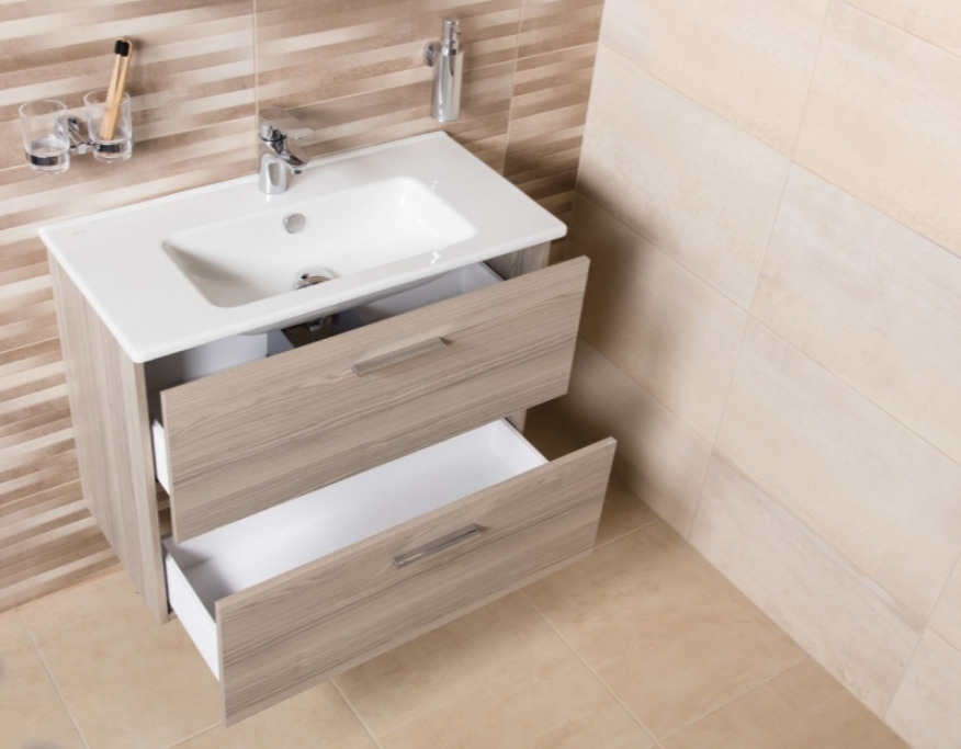 - Meuble à deux tiroirs, fermeture douce : tiroir du haut avec découpe pour siphon + tiroir du bas grand format