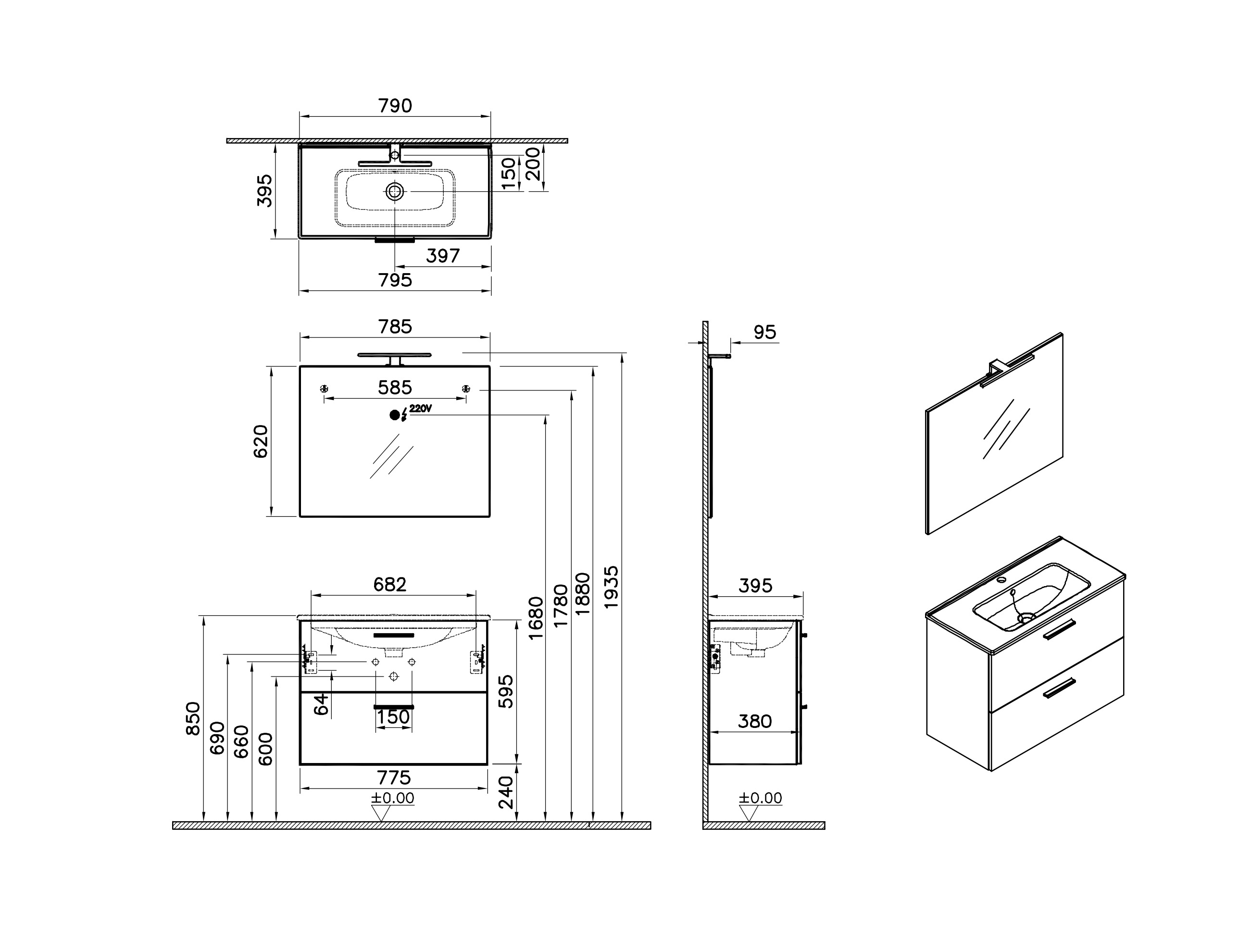 Contenu du Set Mia meuble 79x61x39,5 cm avec miroir, lavabo, éclairage LED + armoire 145x35x35cm pour salle de bain, Cordoba :