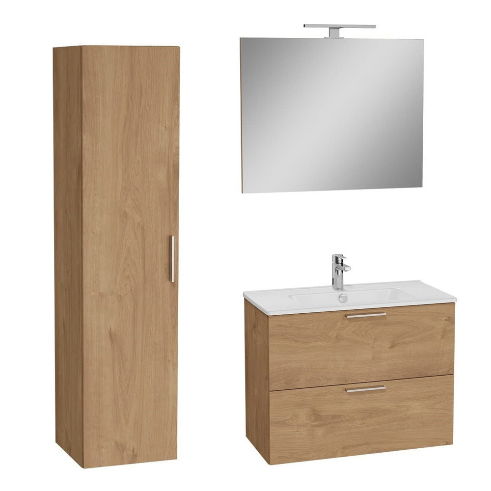 Vitra Set Mia ensemble meuble 79x61x39,5 cm avec miroir, lavabo et éclairage LED + armoire 145x35x35 cm, Chêne
