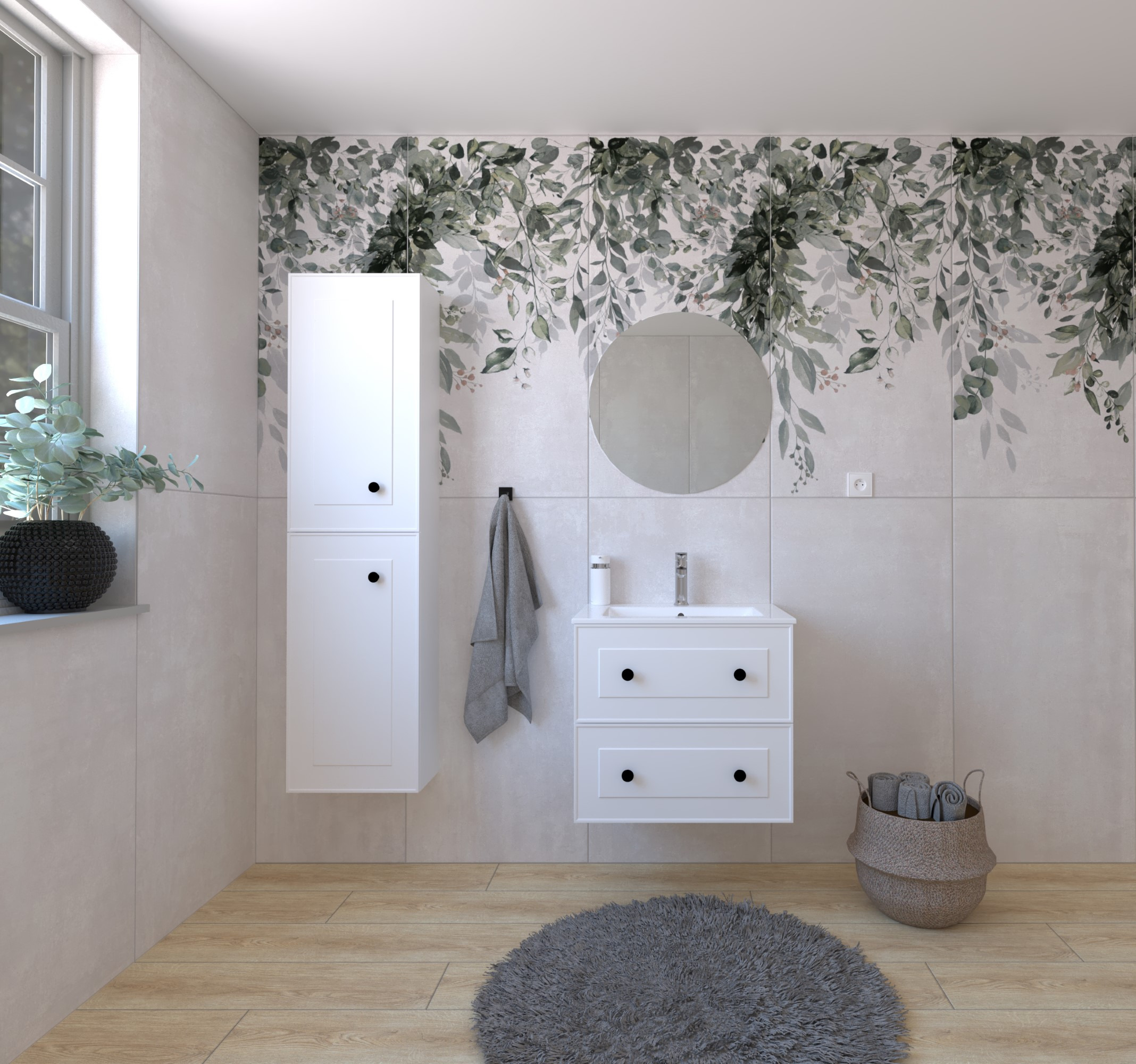 - Miroir rond avec éclairage LED sans interrupteur, diamètre 60 cm. La température de couleur de l'éclairage est de 6 000 K (blanc plus froid). Il est protégé contre les projections d'eau avec une protection IP44.