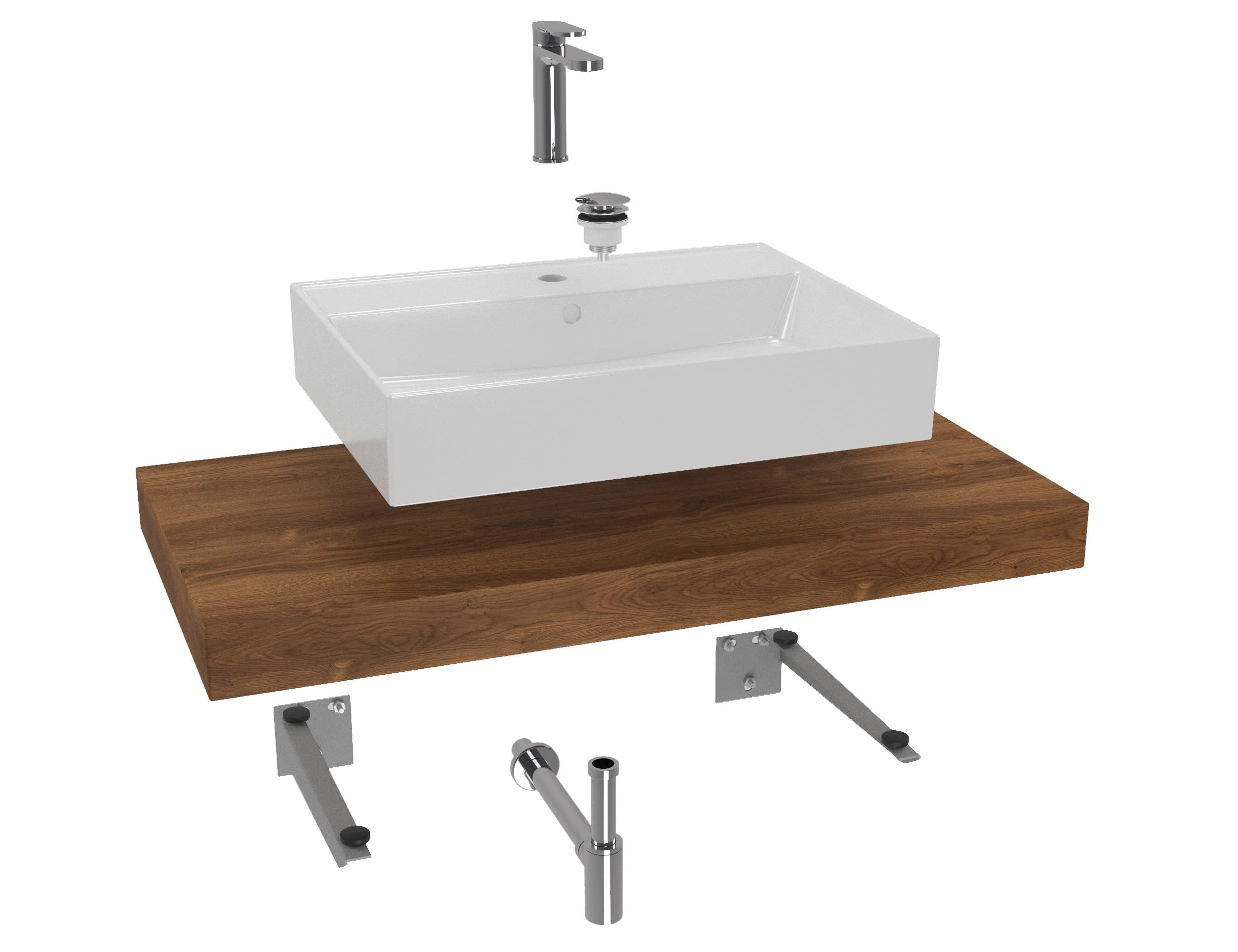 L'ensemble de salle de bain à prix réduit se compose de sept produits : robinet, lavabo, plaque sous le lavabo, bouchon, siphon, console 2x