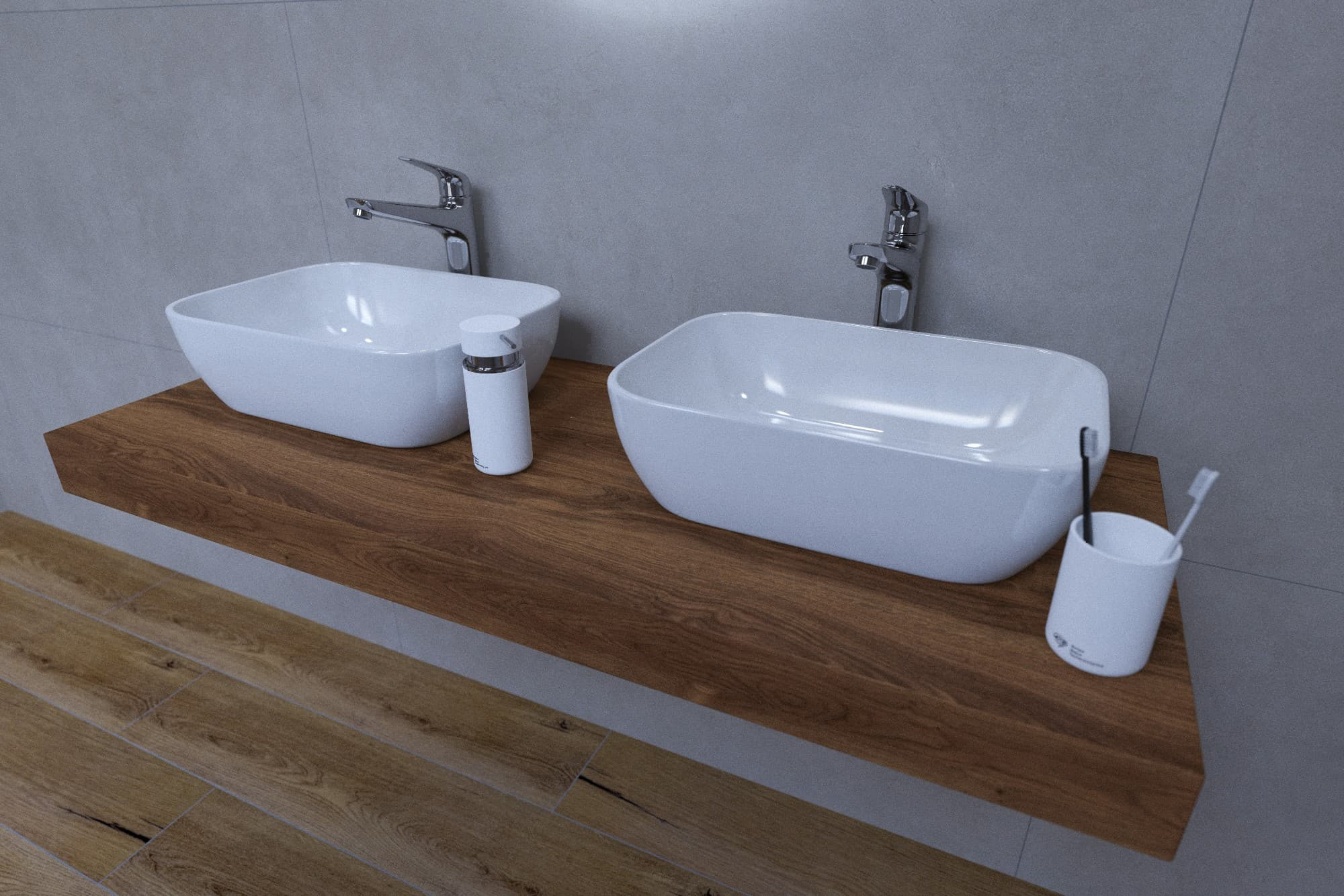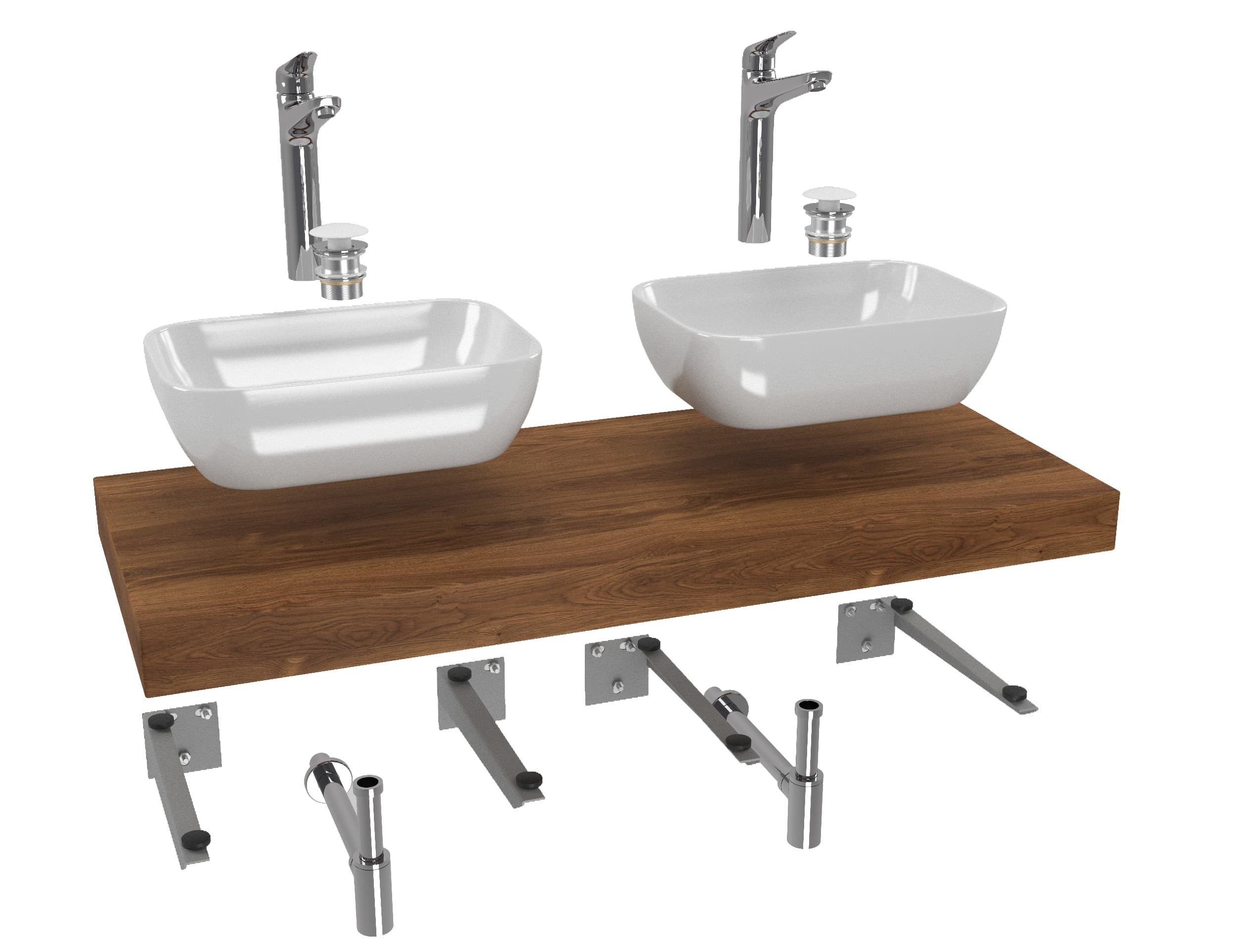 L'ensemble de salle de bain à prix réduit se compose de treize produits - robinet 2x, lavabo 2x, plaque sous le lavabo, bouchon 2x, siphon 2x, support 4x