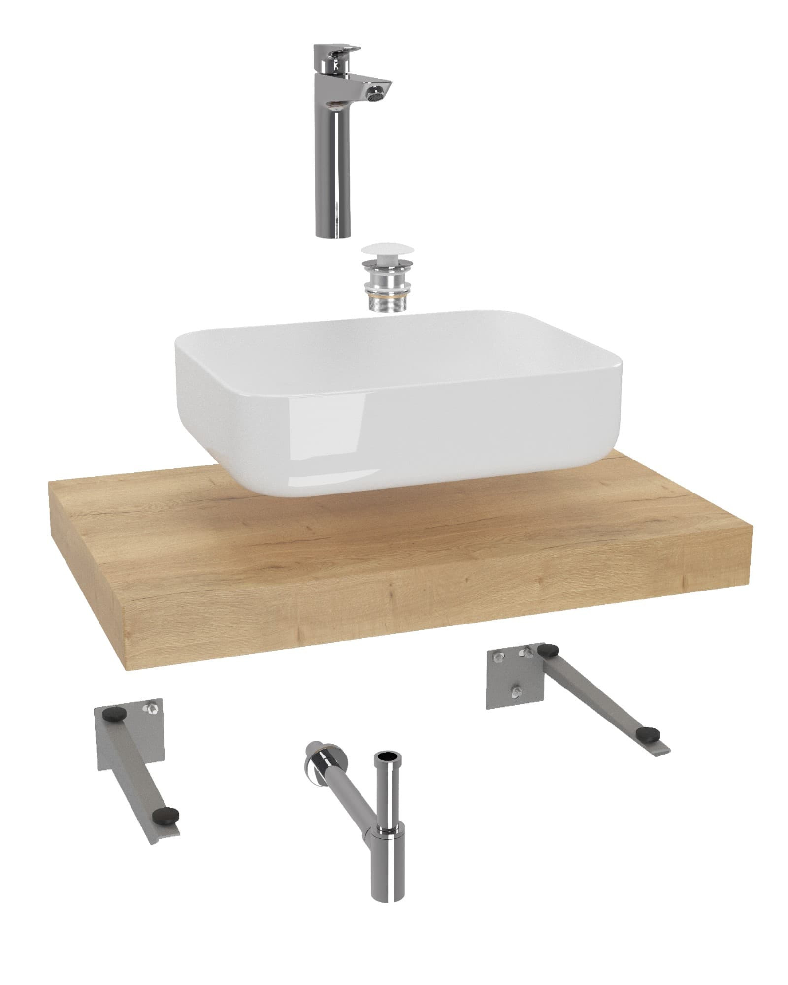 L'ensemble de salle de bain à prix réduit se compose de sept produits : robinet, lavabo, plaque sous le lavabo, bouchon, siphon, console 2x