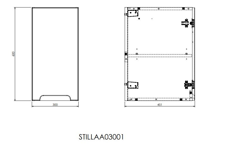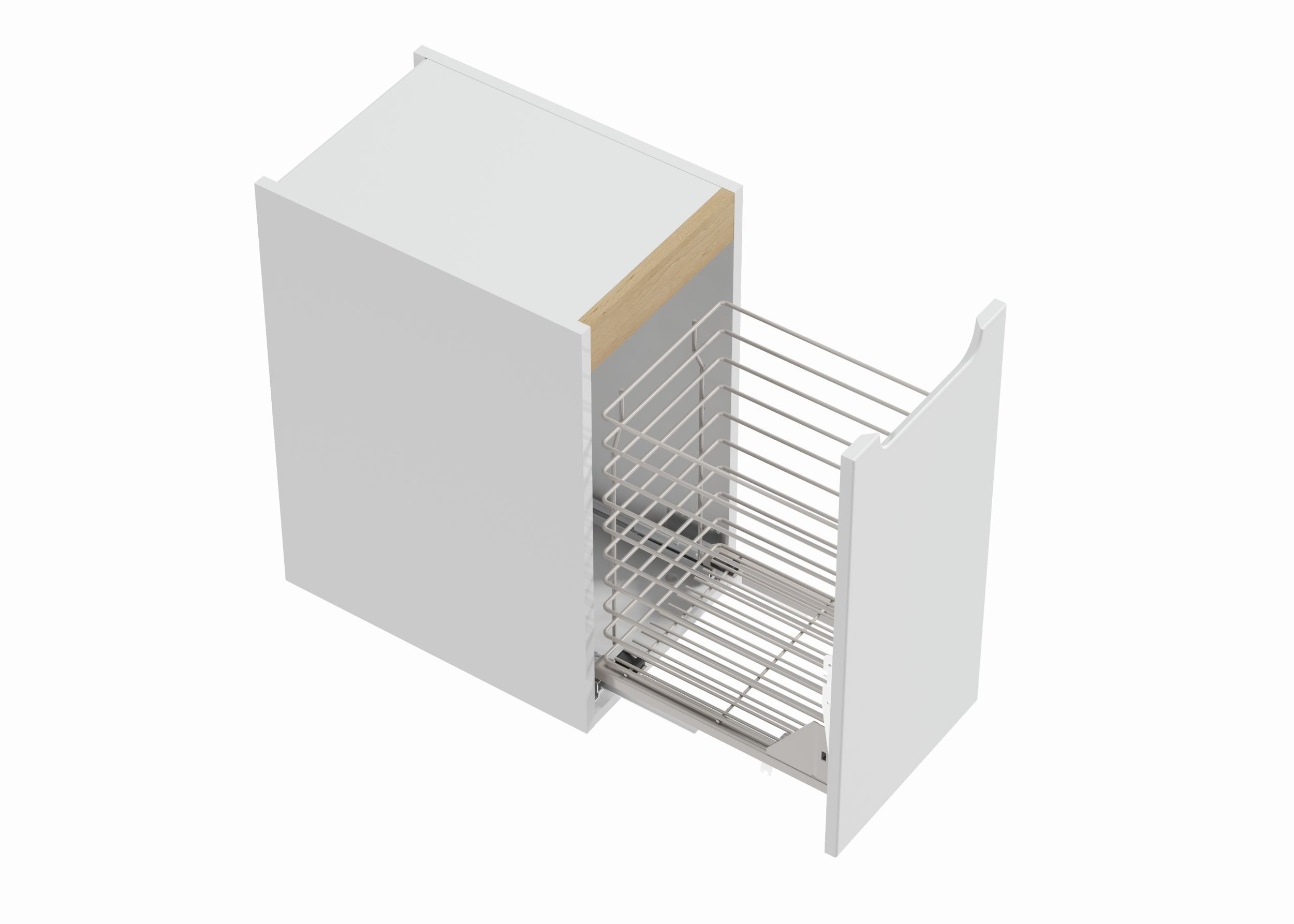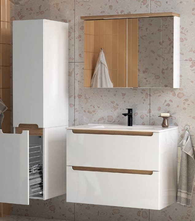 Meuble de salle de bain STILLAA03001KOS avec panier à linge intégré. La façade et le corps sont pourvus d'un vernis photopolymérisable. Derrière la poignée fraisée se trouve un panneau visible qui confère au meuble un caractère unique.