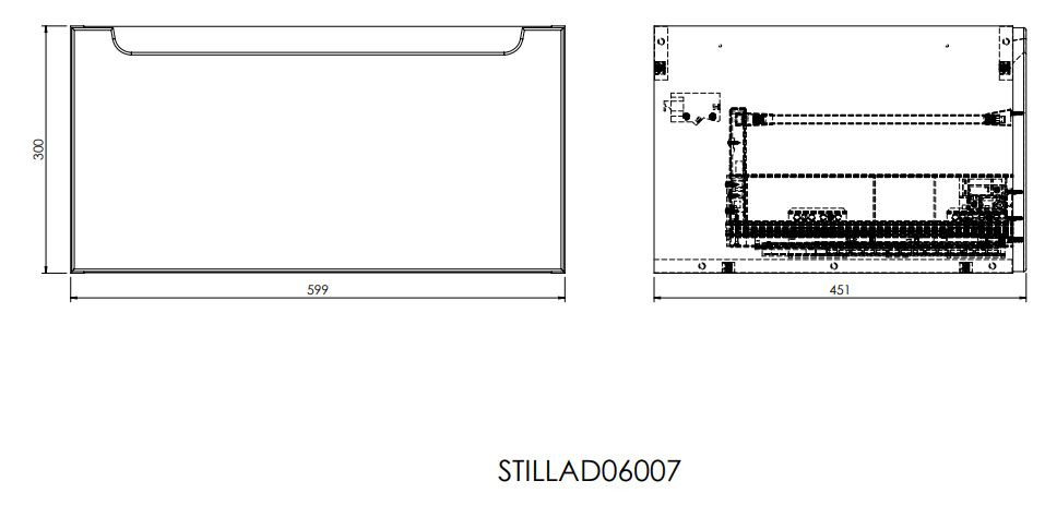 Meuble de salle de bain mural sous lavabo avec table STILLAF06009 en noir. Dimensions 60x30x45cm. Face avant en mélaminé laqué. Tiroir avec découpe pour siphon. Le produit est livré démonté, avec instructions de montage.