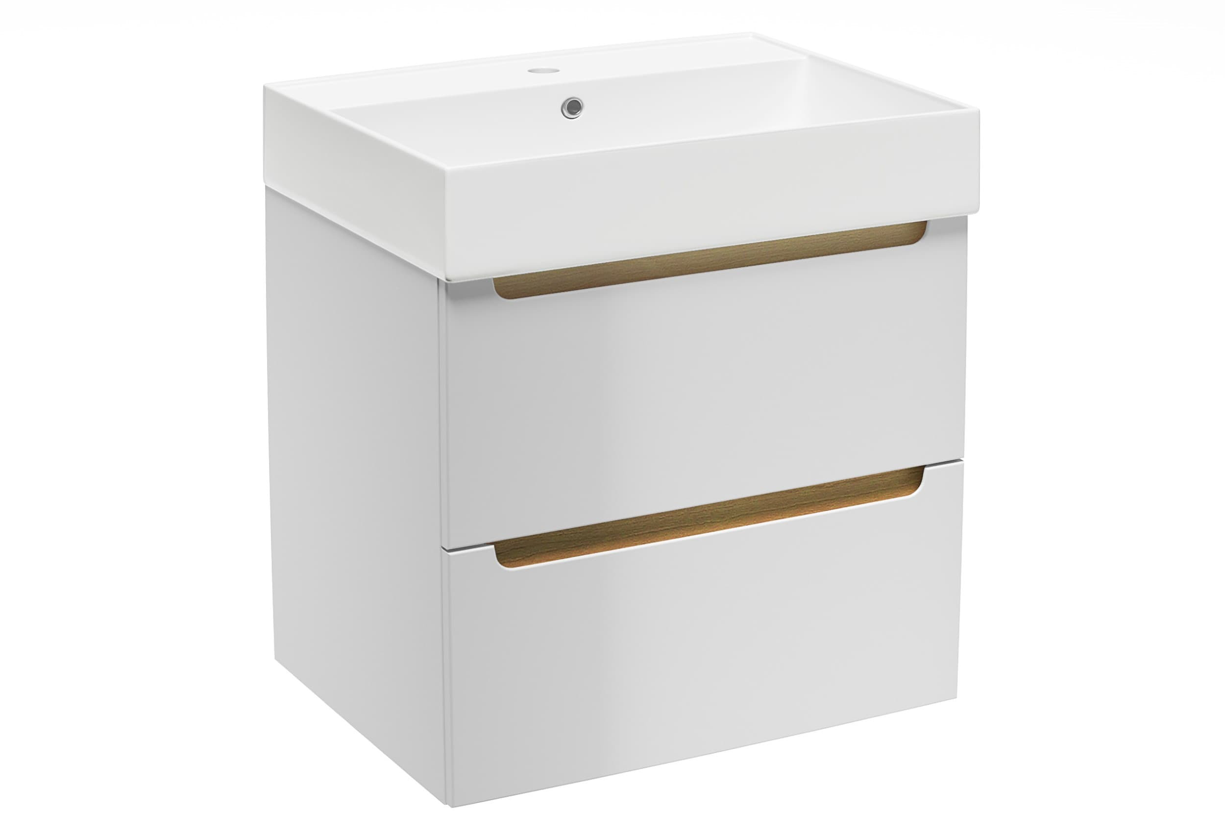 Meuble de salle de bain suspendu avec lavabo en céramique SATINF6046 en blanc. Dimensions 60x60x45 cm. Face avant en mélaminé laqué. Tiroir supérieur avec découpe pour siphon. Le produit est livré démonté, avec instructions de montage.