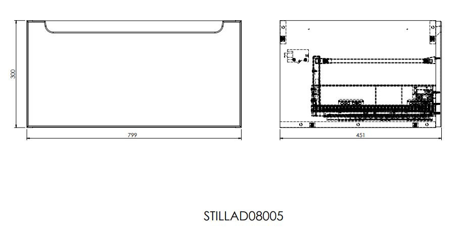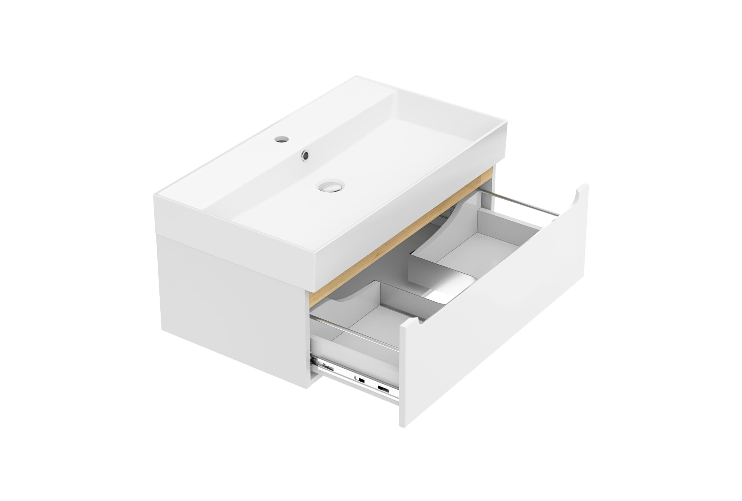 Meuble de salle de bain suspendu avec lavabo en céramique SATINF8046 en blanc. Dimension 80x30x45 cm. Face avant en MDF laqué. Tiroir avec découpe pour siphon. Le produit est livré démonté, avec instructions de montage.