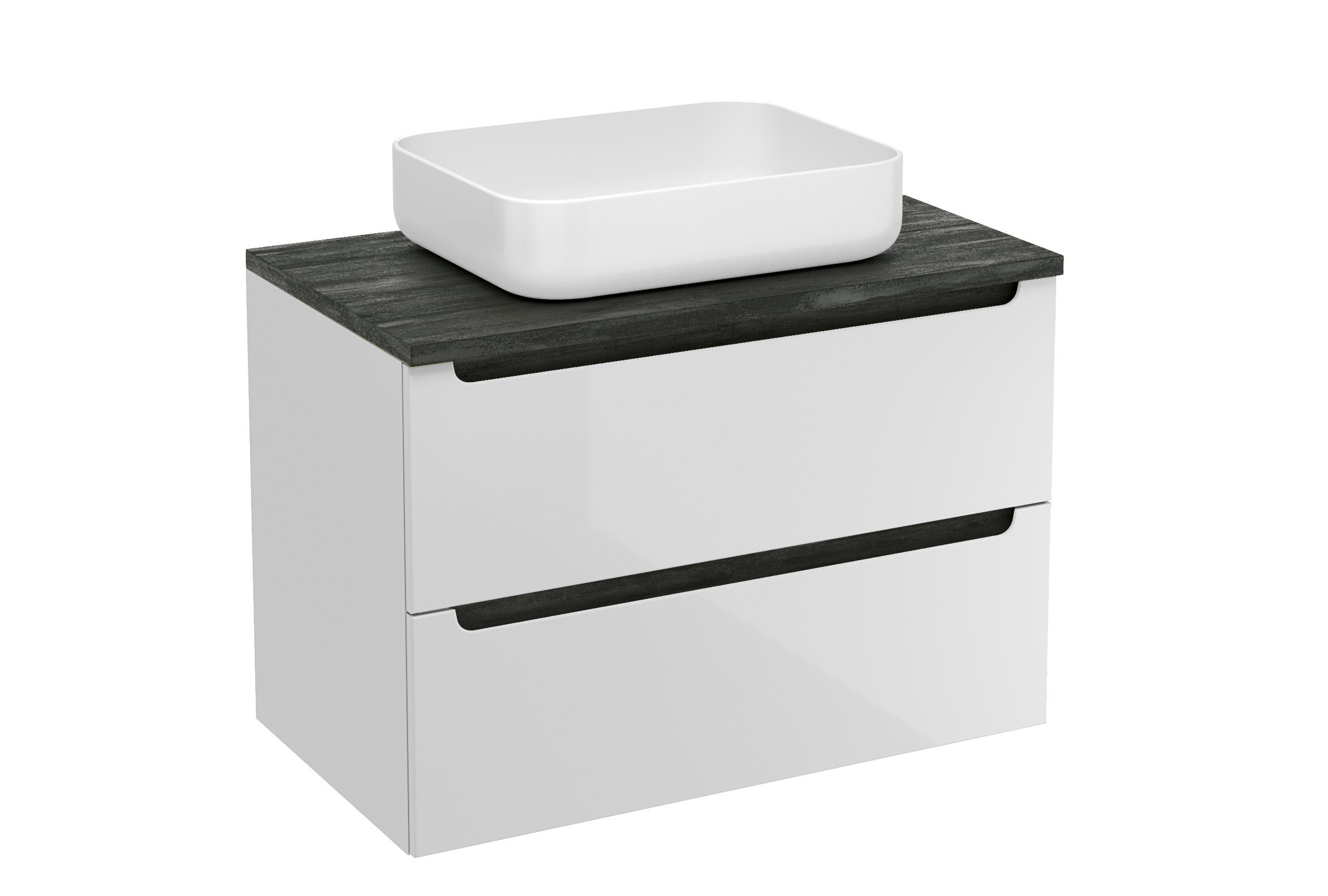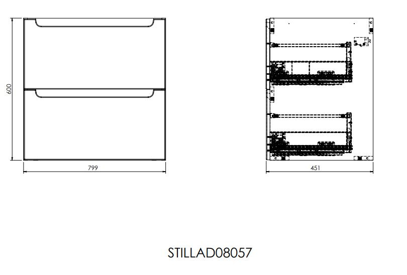 Meuble de salle de bain suspendu Stilla avec deux tiroirs de dimensions 80x60x45 cm avec plaque de recouvrement de couleur noir béton. Le meuble fait partie de la collection modulaire et peut être combiné avec le plateau de la couleur de votre choix. En choisissant un plateau plus large que le meuble, il est possible de créer un agencement individuel en ajoutant d'autres meubles et des caissons de la collection. Cette solution vous permet d'obtenir plus d'espace de rangement pour tous les accessoires de salle de bain.