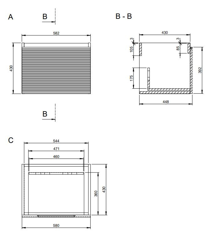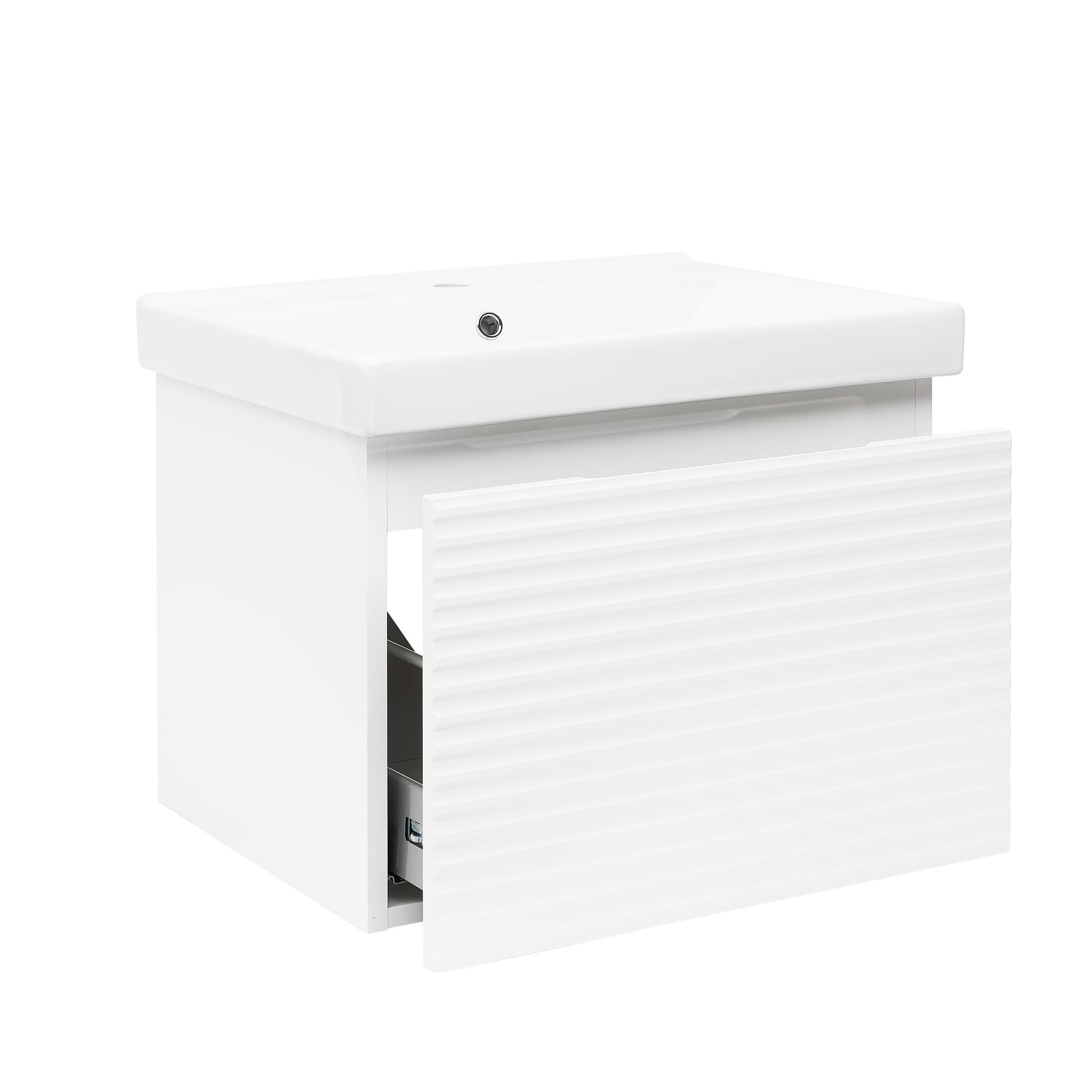 Meuble de salle de bain suspendu avec lavabo en céramique de couleur blanc brillant. Avec une surface brillante mesurant 58x43x44,8 cm. Surface stratifiée.