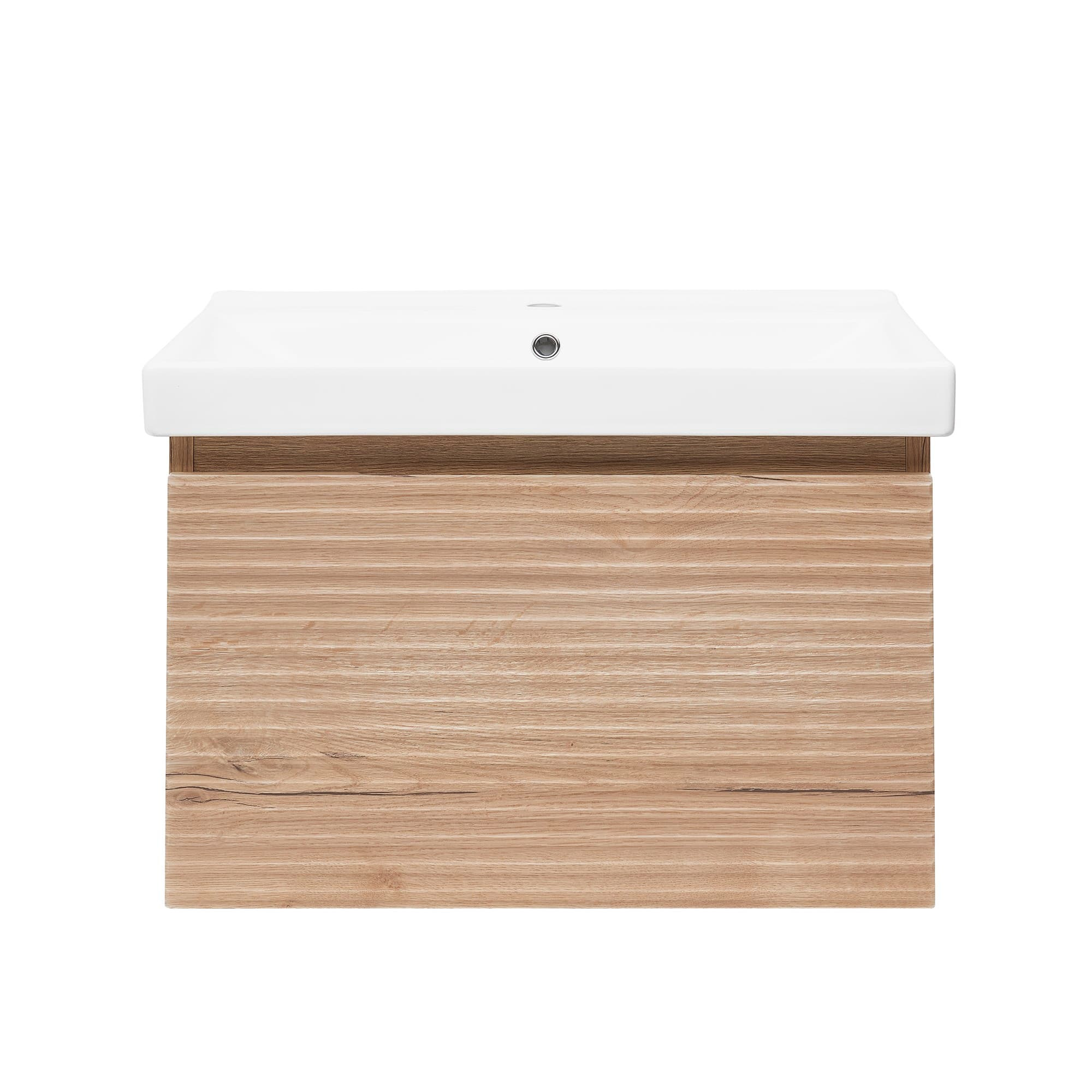 Meuble de salle de bain suspendu avec lavabo en céramique décor chêne halifax à surface mate, mesurant 78x43x44,8 cm. Surface stratifiée.