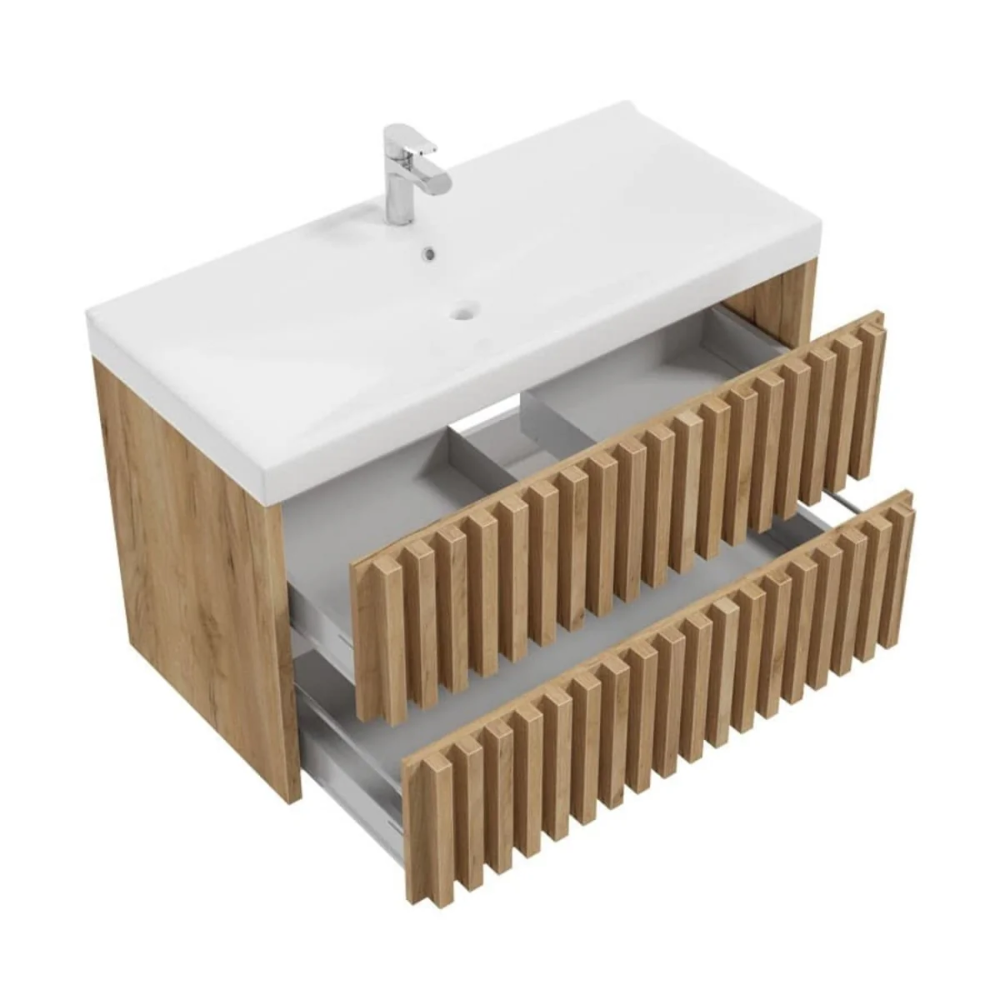 Nous vous présentons notre nouveauté, le meuble vasque de salle de bain SAT Delano en chêne mat avec 2 tiroirs. Ce meuble n'est pas seulement un élément pratique et fonctionnel de votre salle de bain, mais apporte également à votre intérieur une touche de design d'intérieur contemporain - lattes verticales.