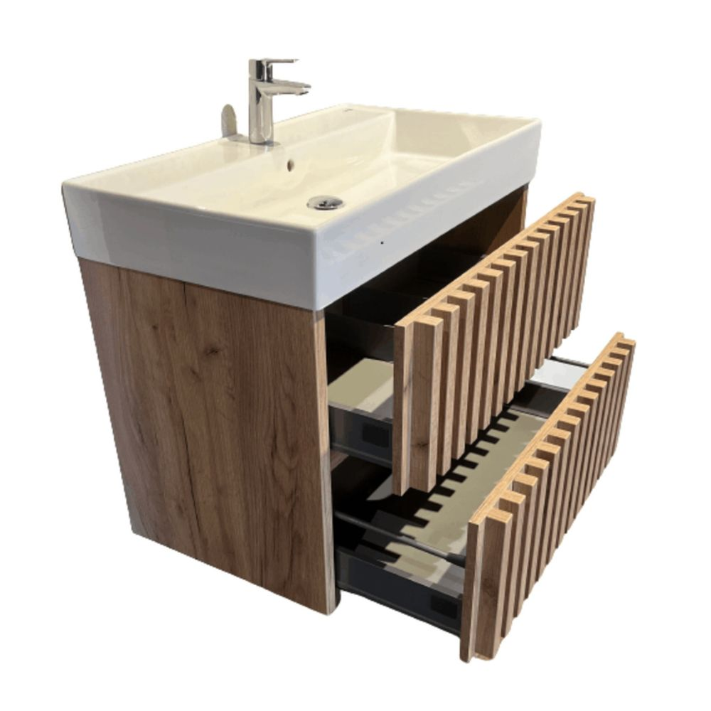 Nous vous présentons notre nouveauté, le meuble de salle de bain SAT Delano avec lavabo en finition chêne mat. Ce meuble n'est pas seulement un élément pratique et fonctionnel de votre salle de bain, mais apporte également à votre intérieur une touche de design d'intérieur contemporain - lattes verticales.