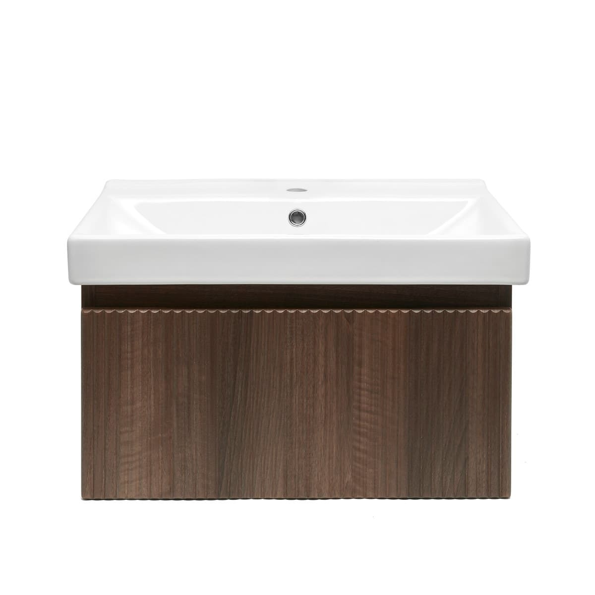 Meuble de salle de bain suspendu avec lavabo en céramique décor noyer avec surface mate mesurant 58x30x44,8 cm. Surface en style filmé.