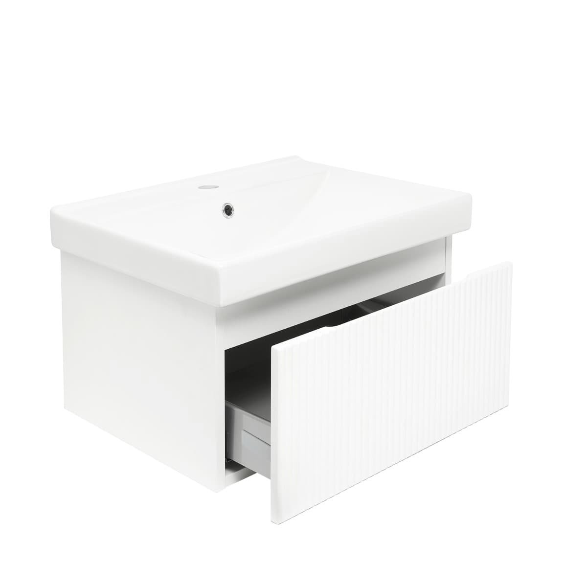 Meuble de salle de bain suspendu avec lavabo en céramique de couleur blanche avec surface mate mesurant 58x30x44,8 cm. Surface en style filmé.