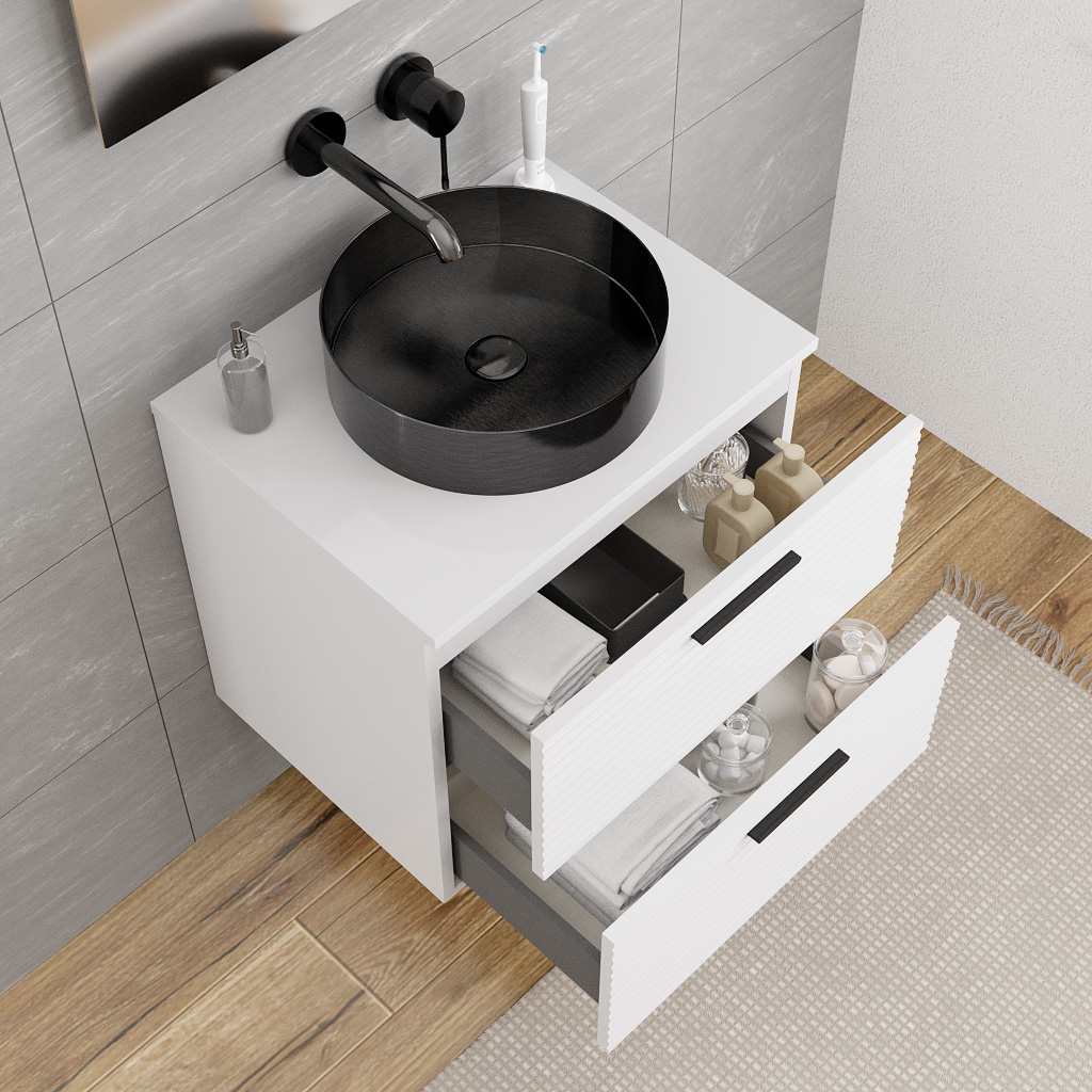 Le meuble assemblé : conçu avec des matériaux de haute qualité, ce meuble Ceramia est doté de panneaux en MDF 18 mm pour les façades et les côtés. L’intérieur est revêtu d’une finition mélaminée de style textile, offrant à la fois résistance, design et facilité d’entretien. Grâce à son système de soft-close, chaque tiroir se referme en douceur, sans bruit ni choc, pour un confort optimal et une durabilité accrue.