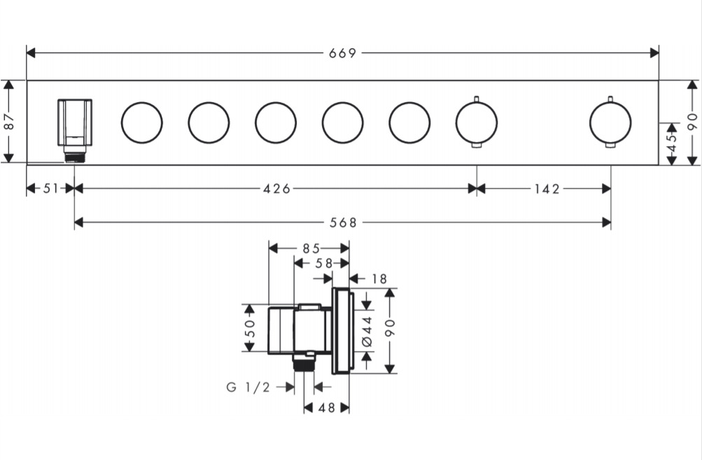Caractéristiques du Module thermostatique Select 670/90 encastré pour 5 sorties, Bronze brossé, Hansgrohe ShowerSolutions (18358140) :
