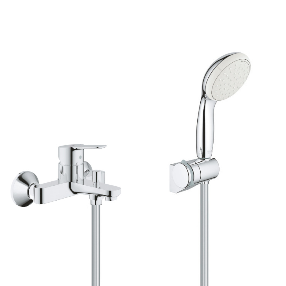 Grohe Set Mitigeur monocommande Bain/Douche BauEdge + Douchette 2 jets Tempesta 100 avec support mural, Chrome MitigeurBD1-Tempesta3