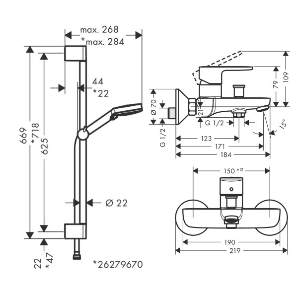 Caractéristiques du Set Mitigeur bain/douche + Douchette Ecosmart 2 jets + Barre 65cm, Chrome Hansgrohe Vernis Blend (71440000-Vernis) :
