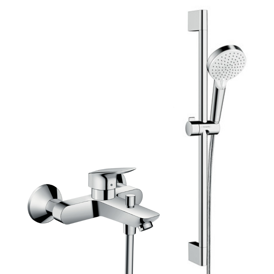 Hansgrohe Set bain/douche Mitigeur Logis + Douchette 2 jets + Barre de douche 65cm + Flexible, Chrome (71400000-CROMETTA)