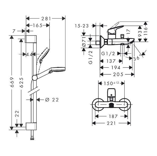 - Entraxe: 150 mm ± 12 mm