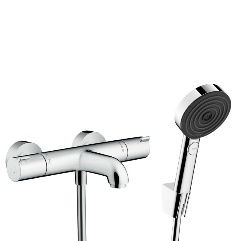 Hansgrohe Ecostat Set Mitigeur Thermostatique bain/douche + Douchette à main 105mm 3 jets + Flexible douche 160cm + Support mural, Chrome