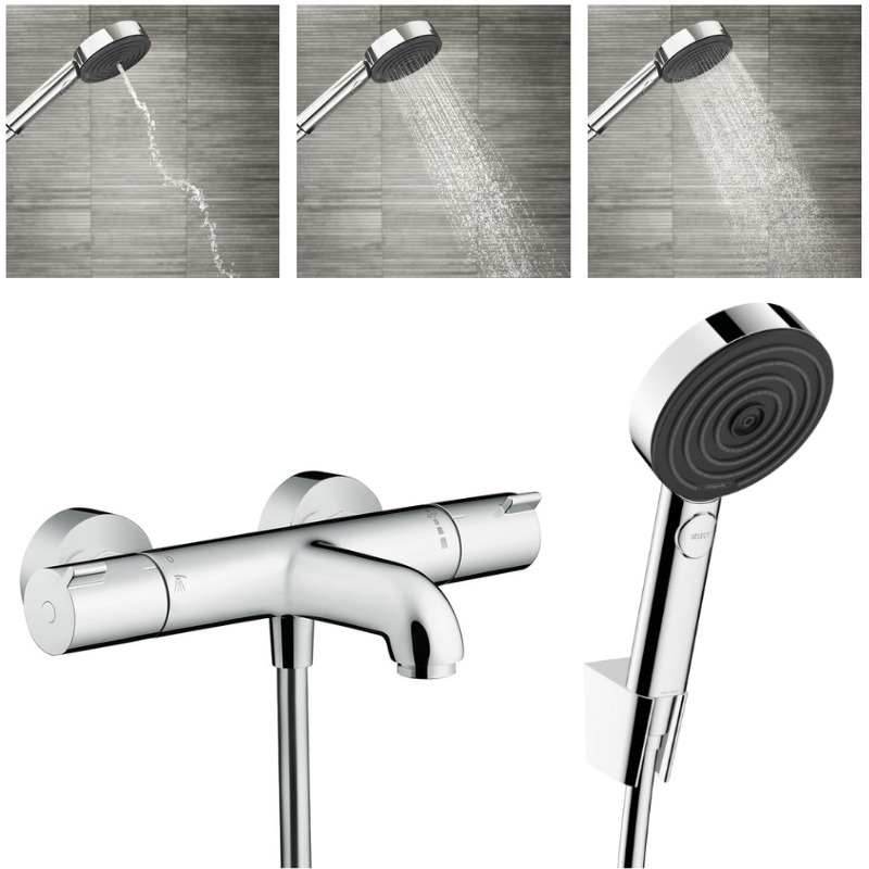 Ecostat Set Mitigeur Thermostatique bain/douche + Douchette à main 105mm 3 jets + Flexible douche 160cm + Support mural, Chrome