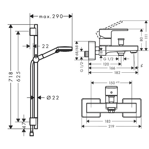 Caractéristiques du Set mitigeur bain/douche + Douchette à main 2 jets + Barre 65cm, Noir mat, Hansgrohe :