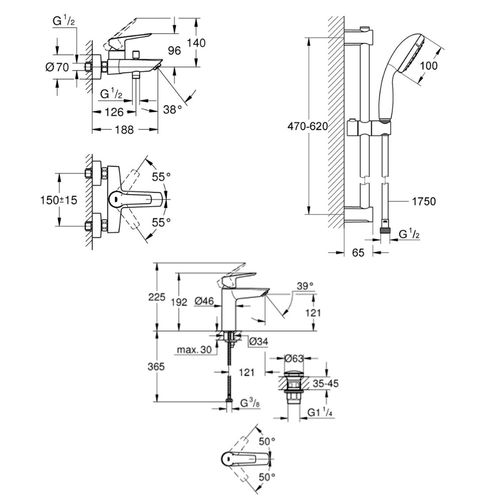 Grohe Set de douche mitigeur bain/douche 1/2" + Douchette 2 jets + Barre 600 mm + Flexible + Mitigeur lavabo taille M, noir mat