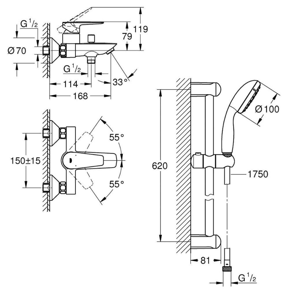 Caractéristiques du Set Mitigeur monocommande bain/douche + Ensemble de douche complet 2 jets, Grohe Tempesta 100, chrome (23914001-Tempesta) :