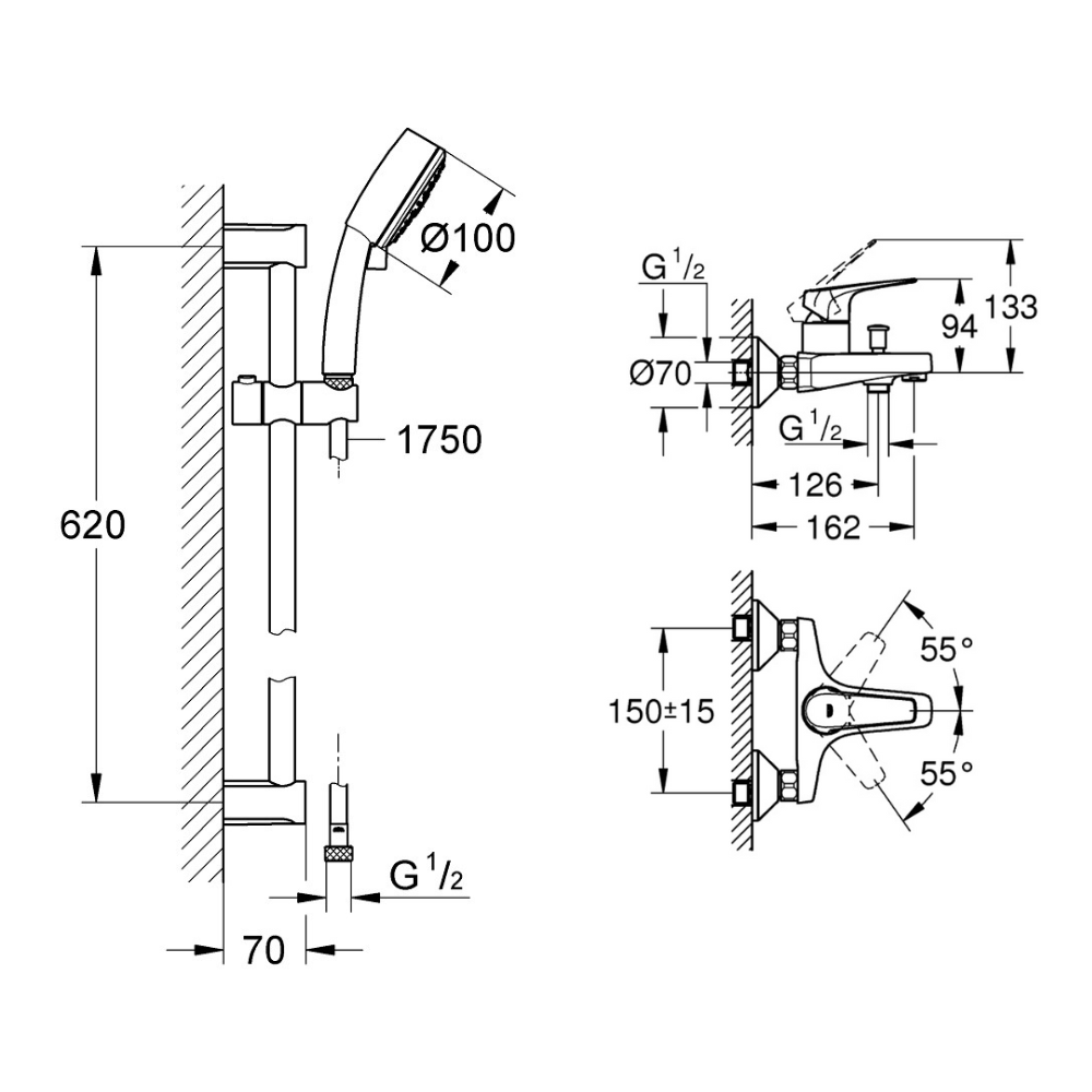 Caractéristiques de l'ensemble de douche 2 jets, Grohe New Tempesta Cosmopolitan 100 + mitigeur de baignoire 1/2", Grohe BauFlow, chrome (23601000-26076002) :