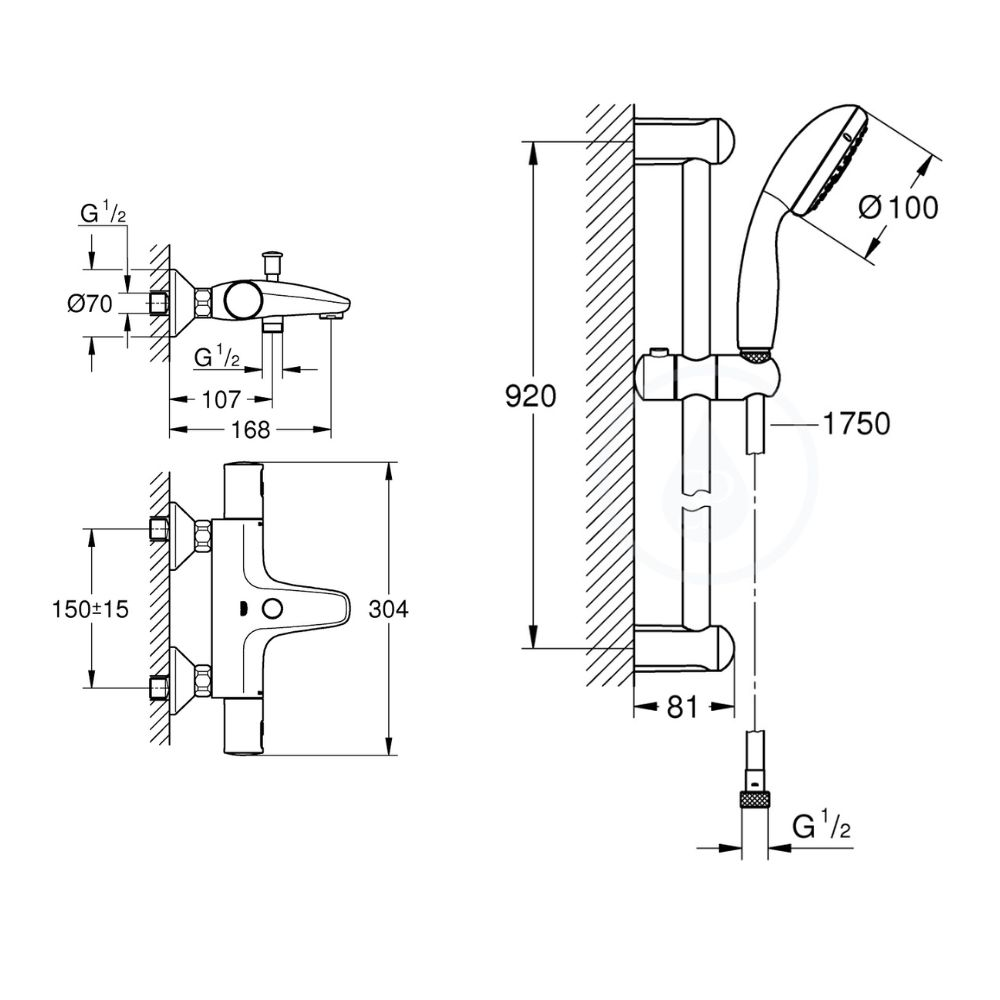 Grohe Tempesta 100 ensemble de douche complet 3 jets + mitigeur thermostatique bain/douche 1/2", chrome (34598000-28789002)