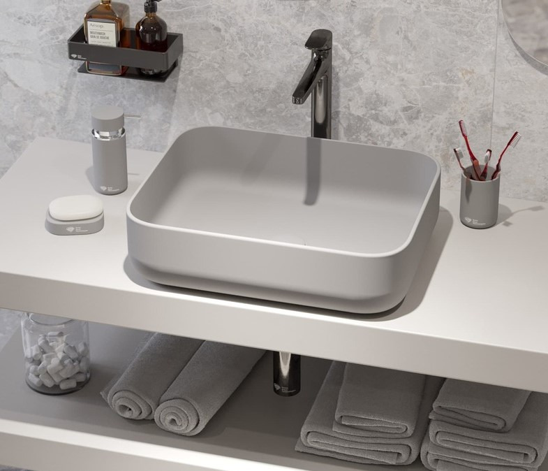 Laissez-vous séduire par ce Set d'accessoires Infinitio composé du Distributeur de savon + Porte savon + Gobelet, En céramique, Gris mat (PackSAT-GrisMat).