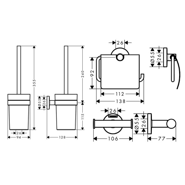 Le pack Brosse WC + Patère salle de bains + Porte-papier toilette, Chrome Hansgrohe Logis Universal (41722000-TRIOLOGIS) est composé de :